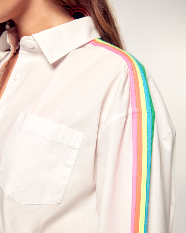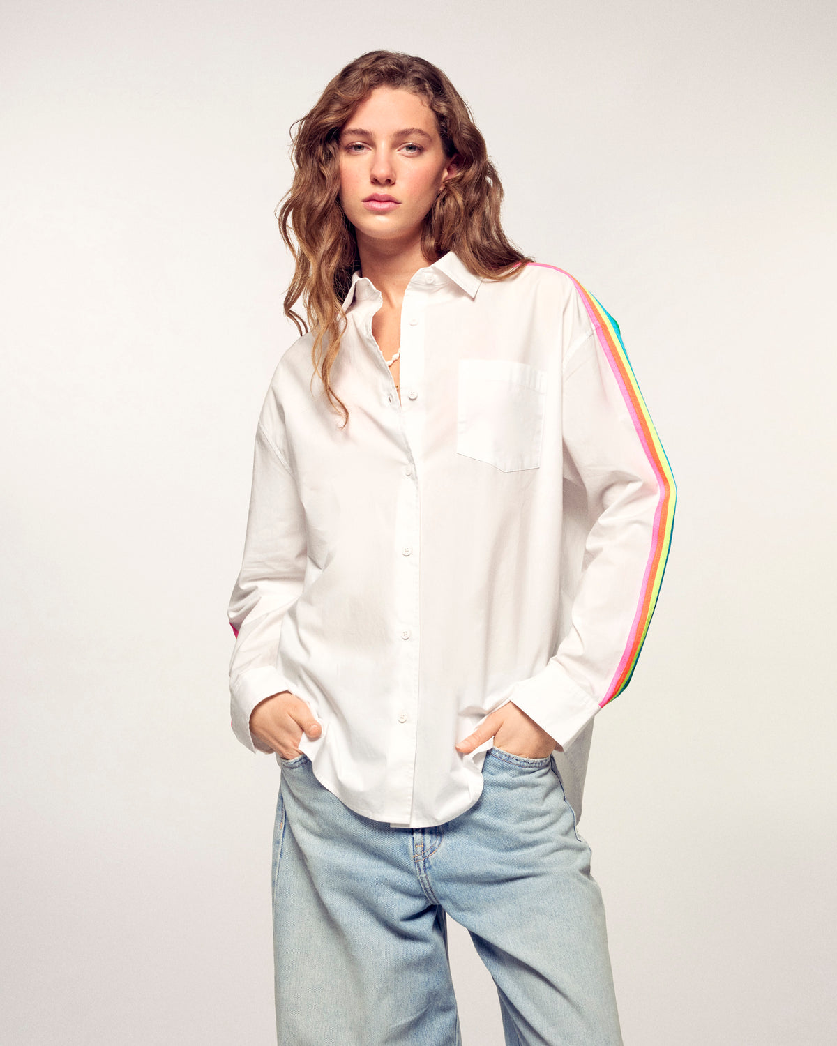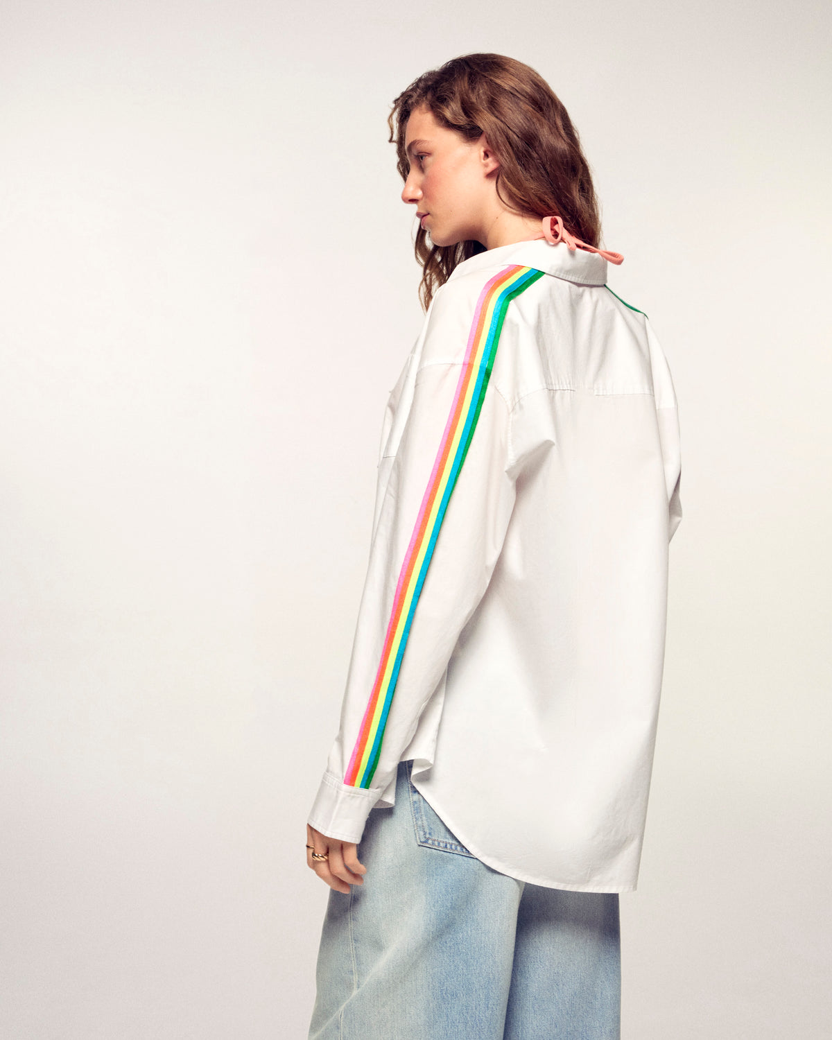 Ein leuchtendes und dynamisches Kleidungsstück, das die Codes des klassischen Hemdes neu interpretiert. Es ist aus Baumwoll-Popeline gefertigt und besticht durch seine bunten Streifen entlang der Ärmel, die für einen grafischen und modernen Look sorgen. Seine Oversize-Passform bietet einen tadellosen Fall und absoluten Komfort im Alltag.
