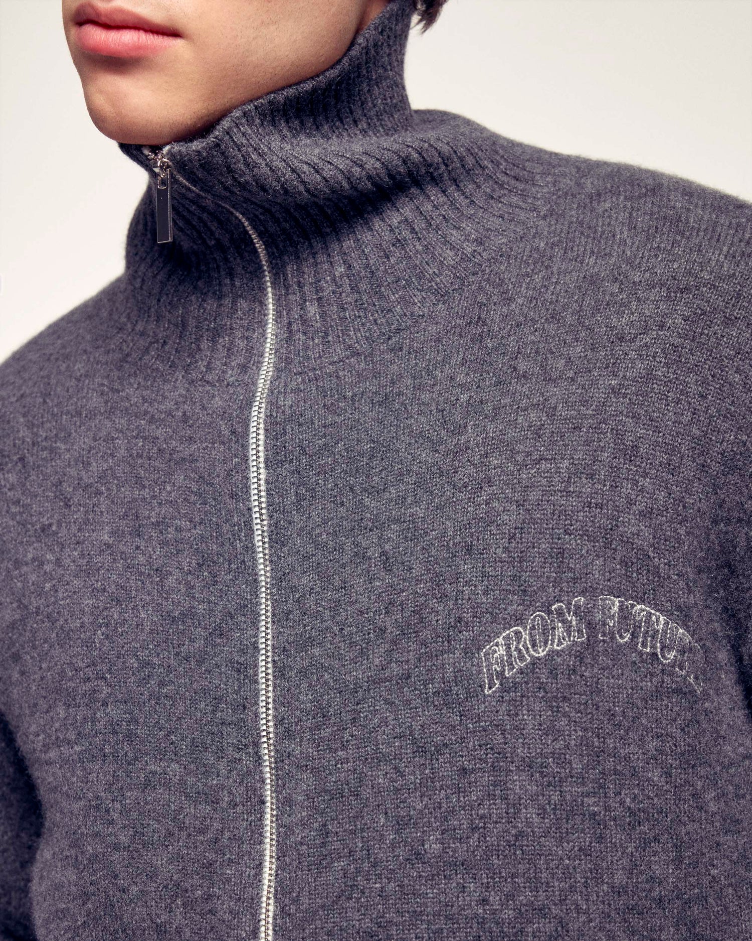 Diese Strickjacke mit Reißverschluss ist aus reinem Kaschmir gefertigt und sorgt für außergewöhnliche Wärme und Weichheit. Ihr klassischer Schnitt und der Stehkragen machen sie zu einem zeitlosen Kleidungsstück, das durch die charakteristische „FROM FUTURE“-Stickerei aufgewertet wird.