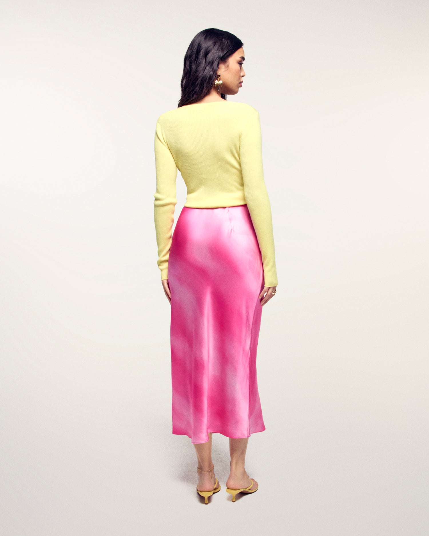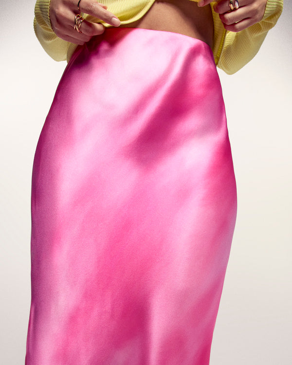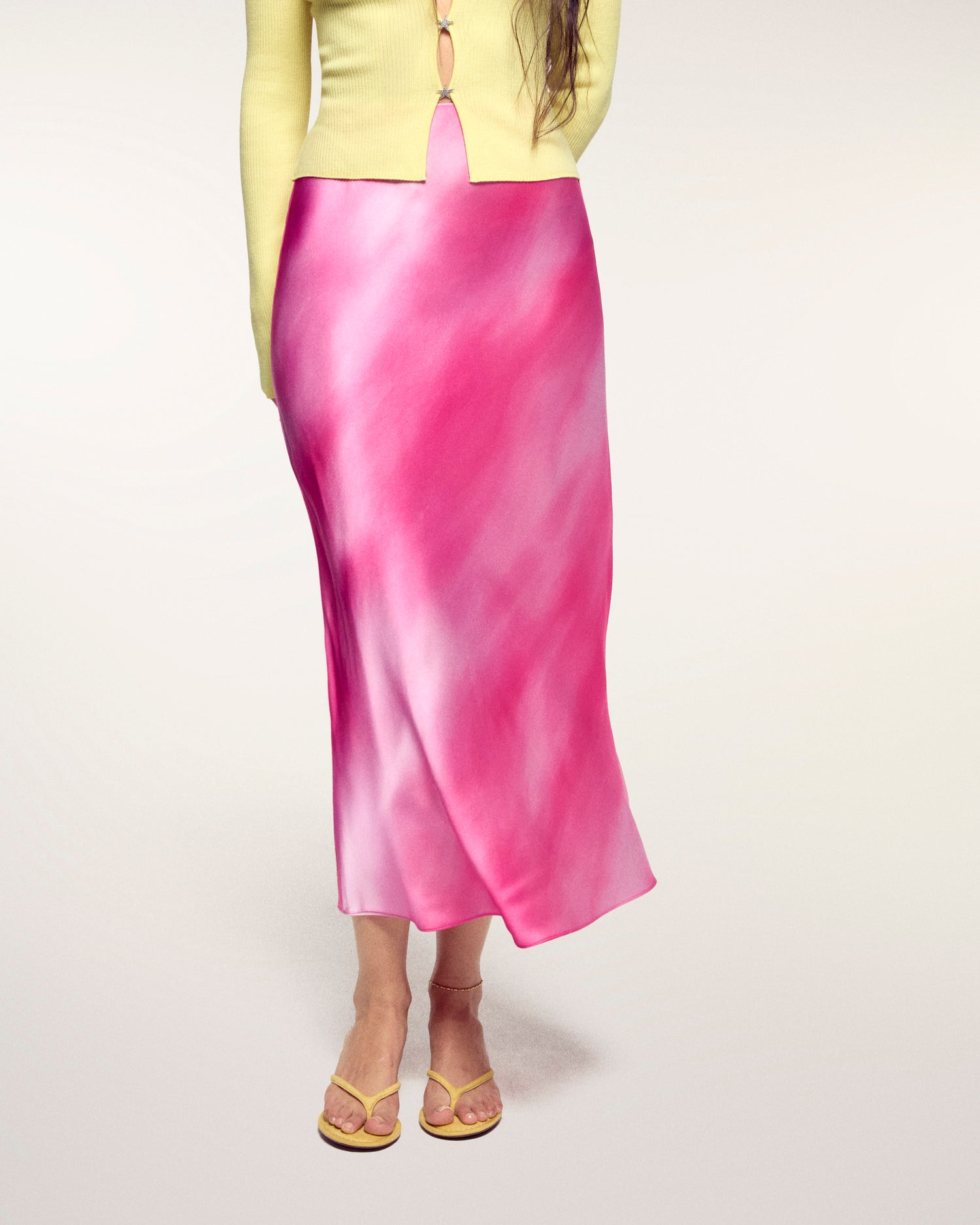 Der aus glänzendem und leichtem Seidensatin gefertigte Midirock Vicky verleiht Ihnen eine besondere Ausstrahlung. Er besticht durch seinen fließenden, ausgestellten Fall und pure Eleganz. Er ist ideal für jede Gelegenheit und lässt sich perfekt mit einem strukturierten Top oder einem Satinhemd kombinieren.