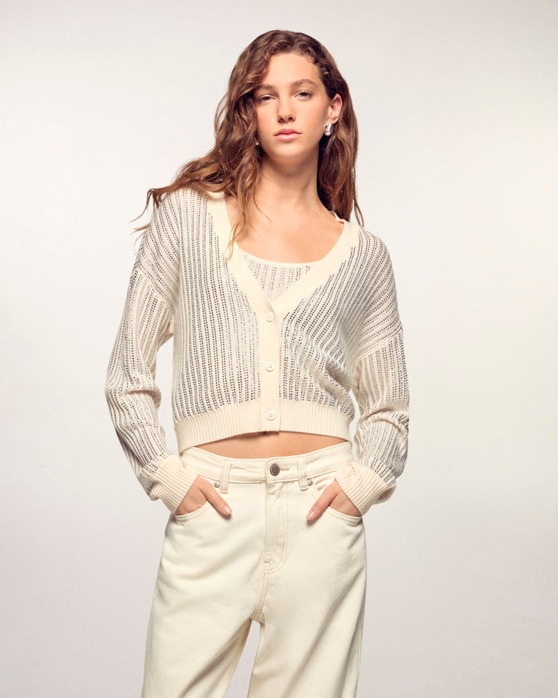 Ein edles und schimmerndes Kleidungsstück, das Ihre saisonale Garderobe zum Strahlen bringt. Dieser Cardigan-Pullover besticht durch seine dezent platzierten silbernen „Hotfix“-Strasssteine, die für einen schicken und anspruchsvollen Look sowie eine entschlossen moderne Silhouette sorgen.