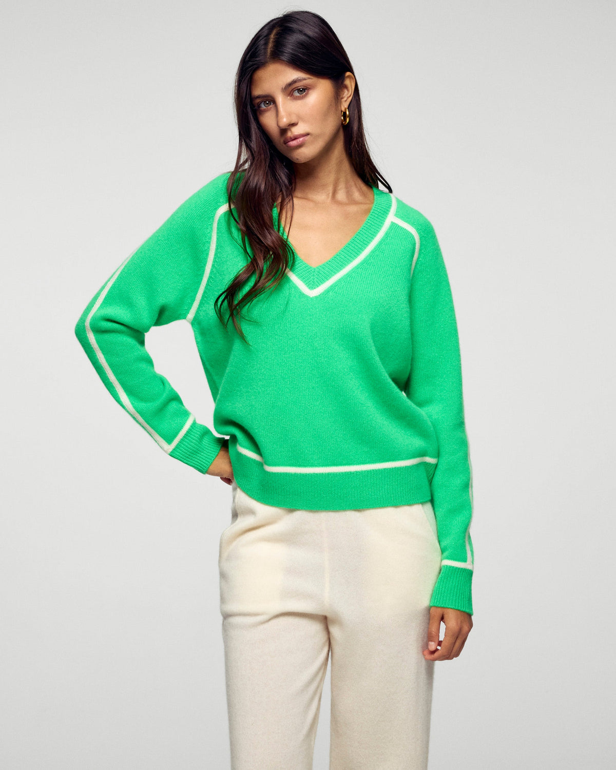 Dieser Pullover aus Kaschmir ist mit gewagten Details versehen. Mit V-Ausschnitt, langen Ärmeln und gerippten Abschlüssen. Kontrasteinfassungen betonen die strukturierte Silhouette. Kombinieren Sie ihn mit einer weiten Jeans oder einer Anzugshose für einen schicken Casual Look.