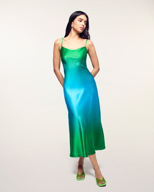 Verschwommener Print und leichter, glänzender Seidensatin für dieses Maxikleid im Nuisette-Stil. Tailliert und stilvoll präsentiert es sich mit einem abgerundeten Dekolleté, verstellbaren schmalen Trägern und einem fließenden Fall. Ideal für Tag und Nacht, kann es sowohl allein als auch unter einem kuscheligen Strick getragen werden.