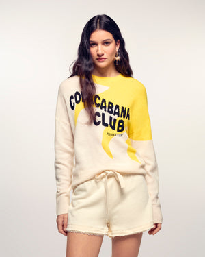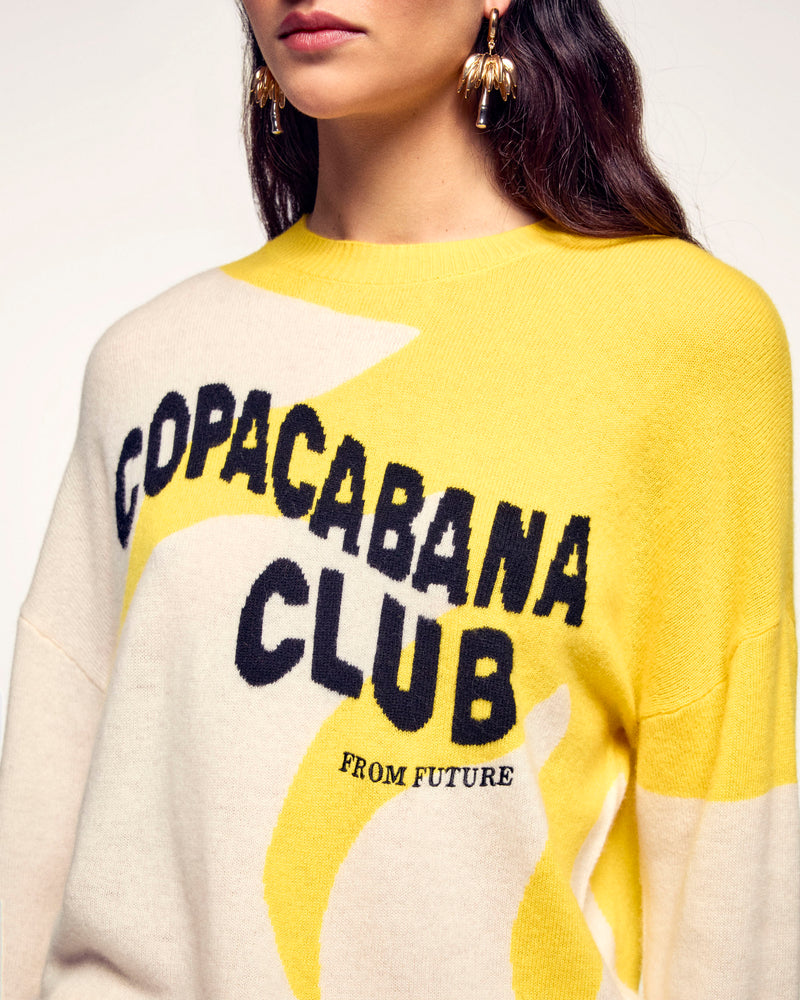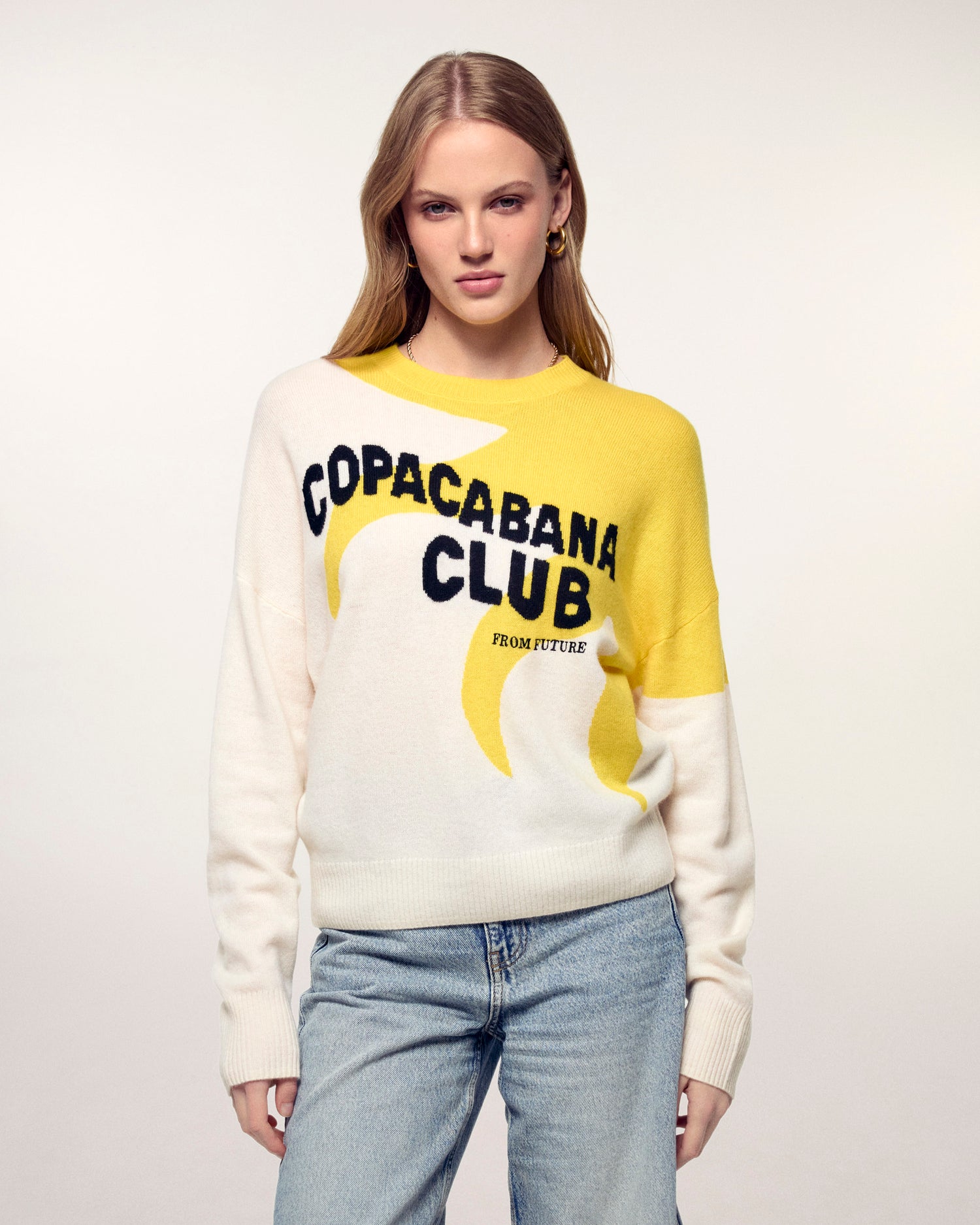 Dieser aus einer Mischung aus Wolle und Kaschmir 2 Fäden gefertigte Pullover bietet einen weichen und leichten Strick. Seine zeitlose normale Passform wird durch ein großes zentrales Sonnenmotiv und den Schriftzug „Copacabana Club“ in Intarsien-Technik dynamisiert, was für einen urlaubsreifen Look sorgt.