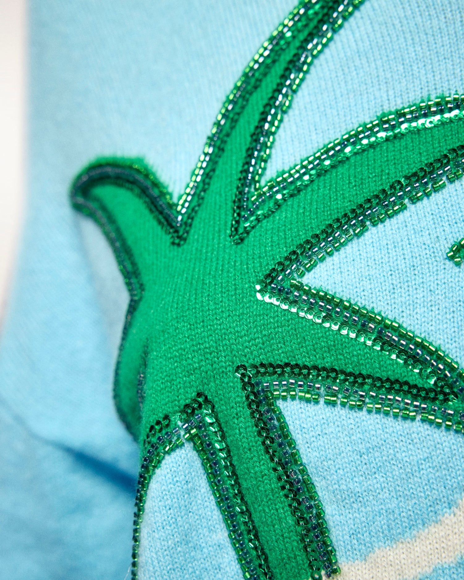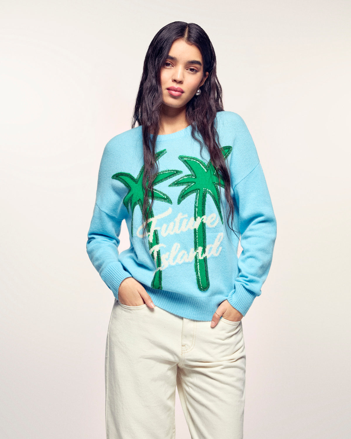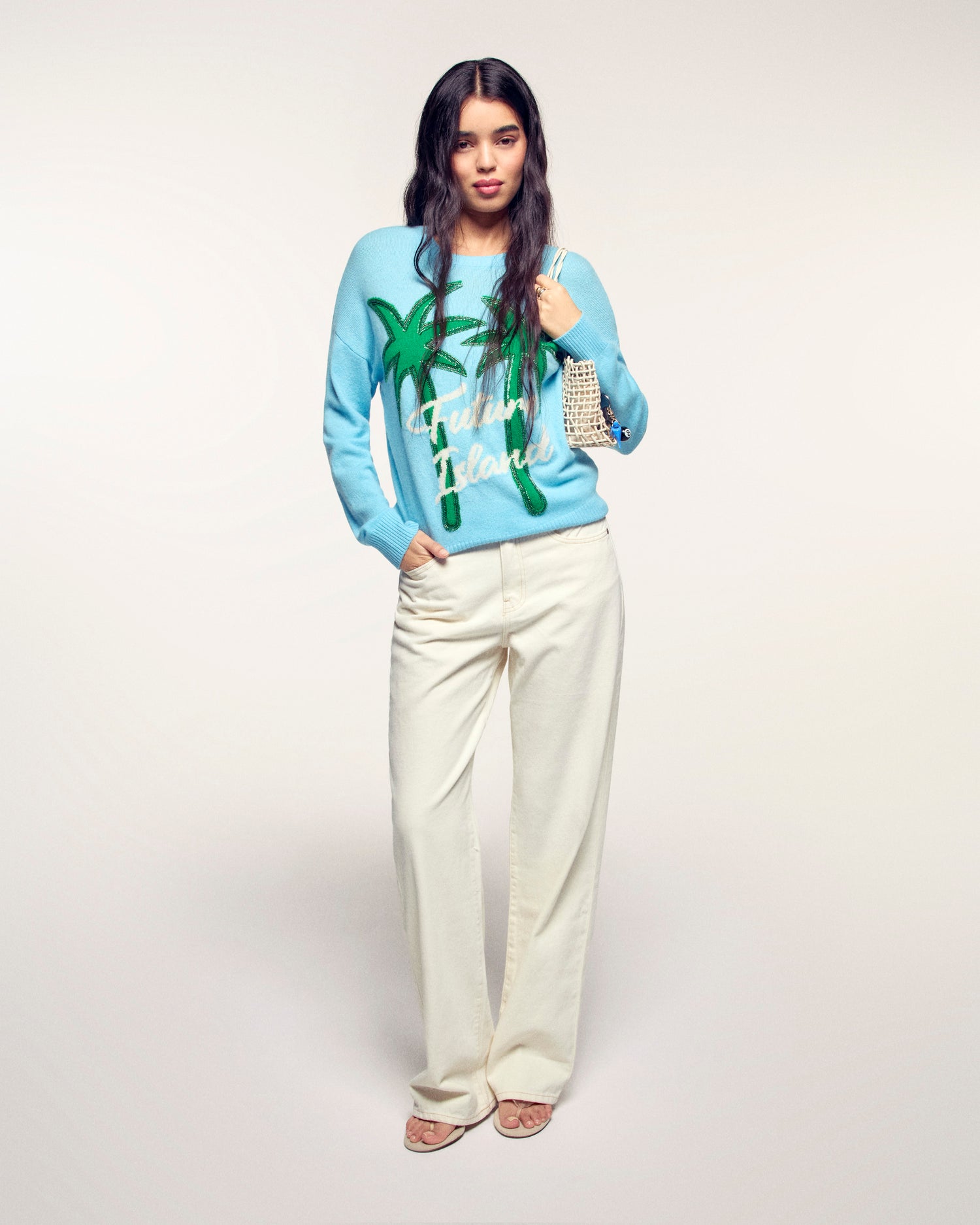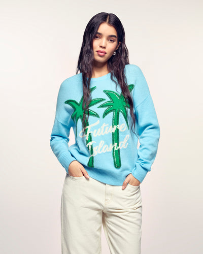 Eine Einladung zum Reisen mit einem Hauch von Glanz. Dieser aus Kaschmir 2 Fäden gefertigte Pullover bietet einen weichen und leichten Strick. Seine zeitlose normale Passform wird durch ein großes „Future Island“-Palmen-Jacquardmuster dynamisiert, dessen Konturen durch eine Stickerei aus Schlauchperlen und Pailletten für einen glitzernden Effekt fein hervorgehoben werden.