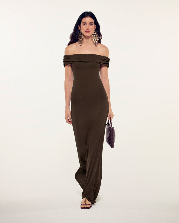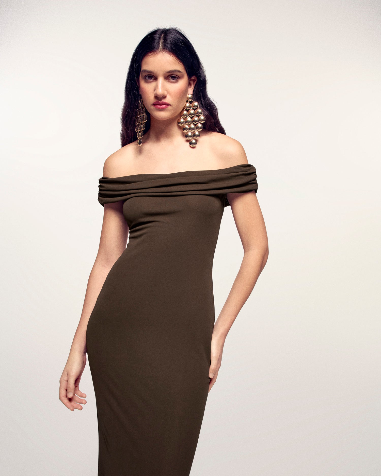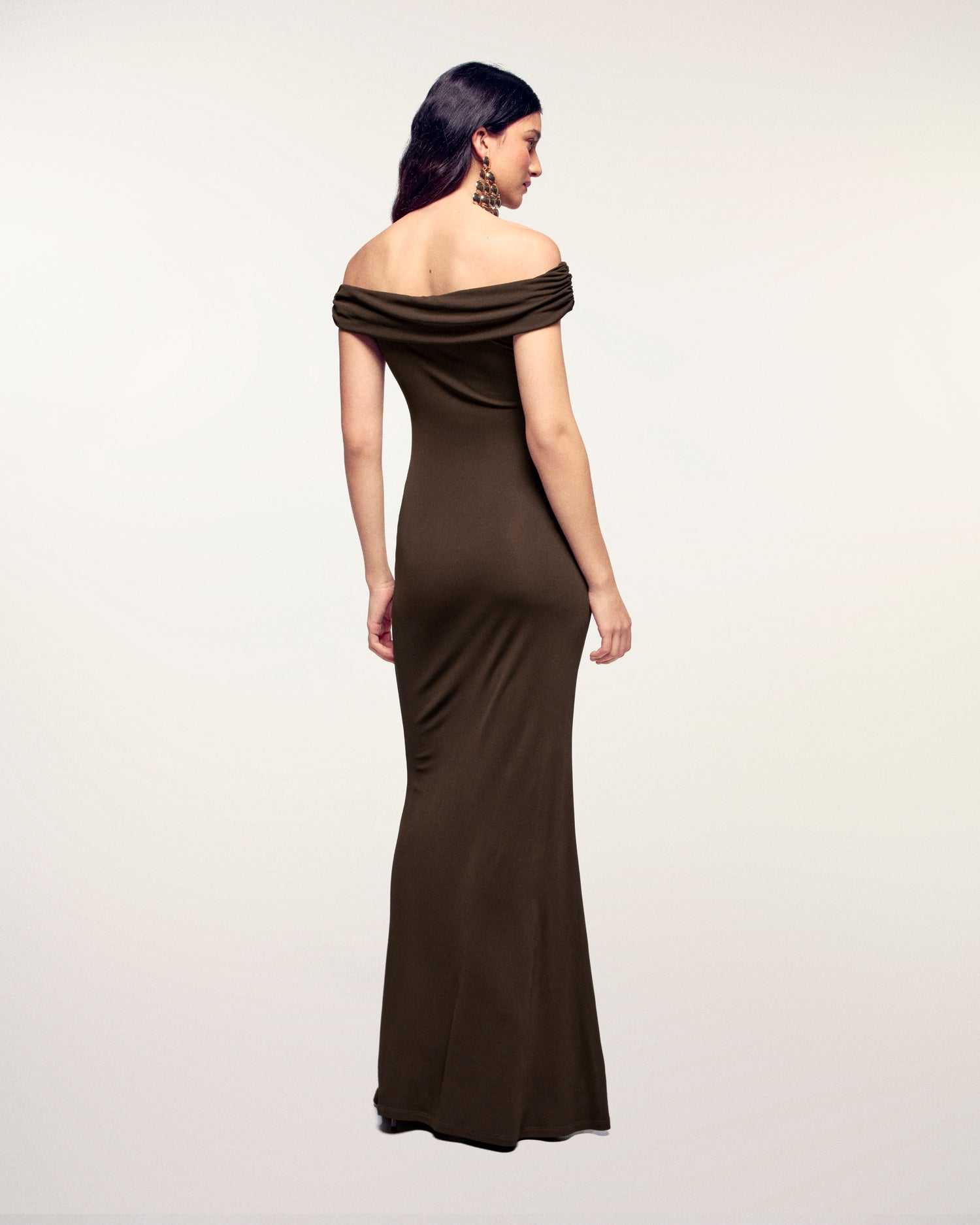Eine skulpturale Silhouette von absoluter Eleganz für dieses Maxikleid. Es besticht durch seinen großzügig drapierten Bandeau-Ausschnitt, der die Schultern raffiniert in Szene setzt und einen zugleich modernen wie zeitlosen Look für Ihre Sommerabende bietet.