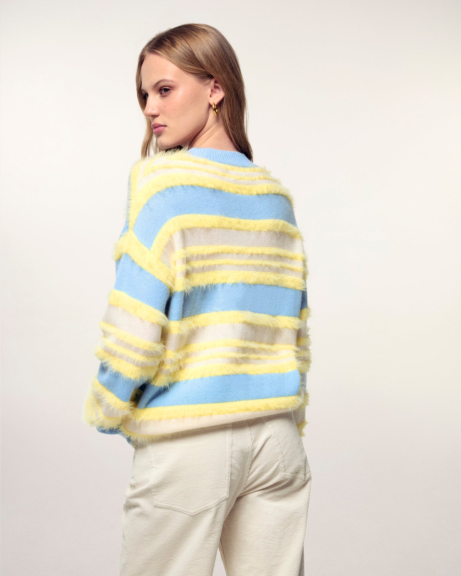 A Pullover Lebhaft gestreifter Strick, der intensive Farben und Textur mischt, mit Kaschmir und umhüllendes Volumen für einen Look voller Energie.