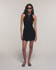 Ein ikonisches und anspruchsvolles Kleidungsstück, das die Silhouette mit Eleganz unterstreicht. Dieses kurze Kleid besticht durch seinen geknöpften Stehkragen und den Tropfenausschnitt, ergänzt durch funkelnde Strassknöpfe für einen entschlossenen Couture-Look.