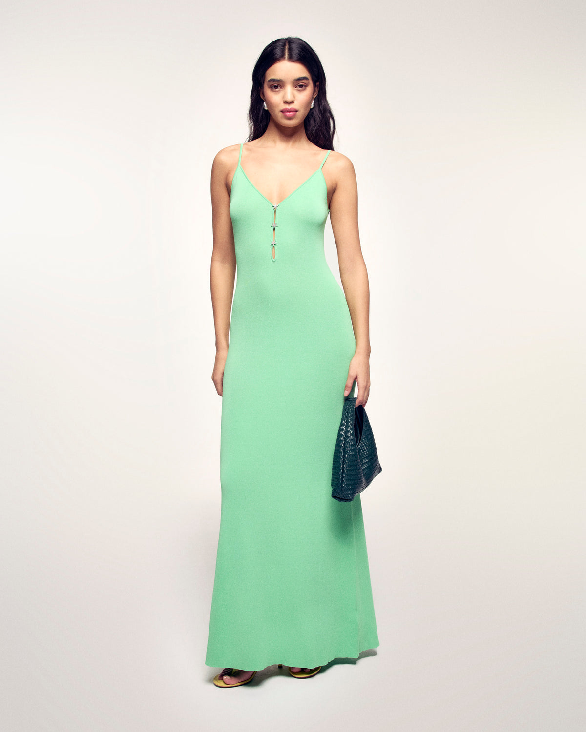 Dieses Kleid bietet eine lange und körpernahe Passform, perfekt um die Silhouette zur Geltung zu bringen. Gefertigt aus Viskose und Nylon, besticht es durch einen feinen Rippstrick. Sein kühnes Detail sind die sternförmigen Strassknöpfe, die das Dekolleté zieren.