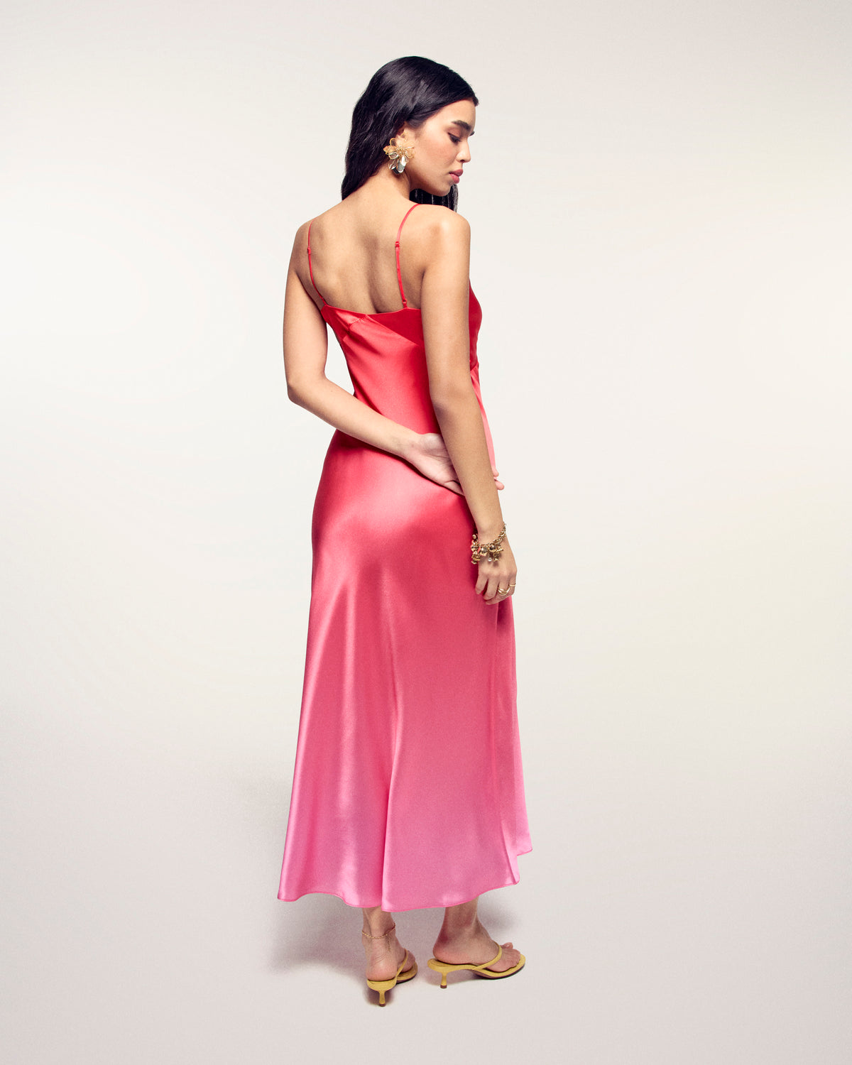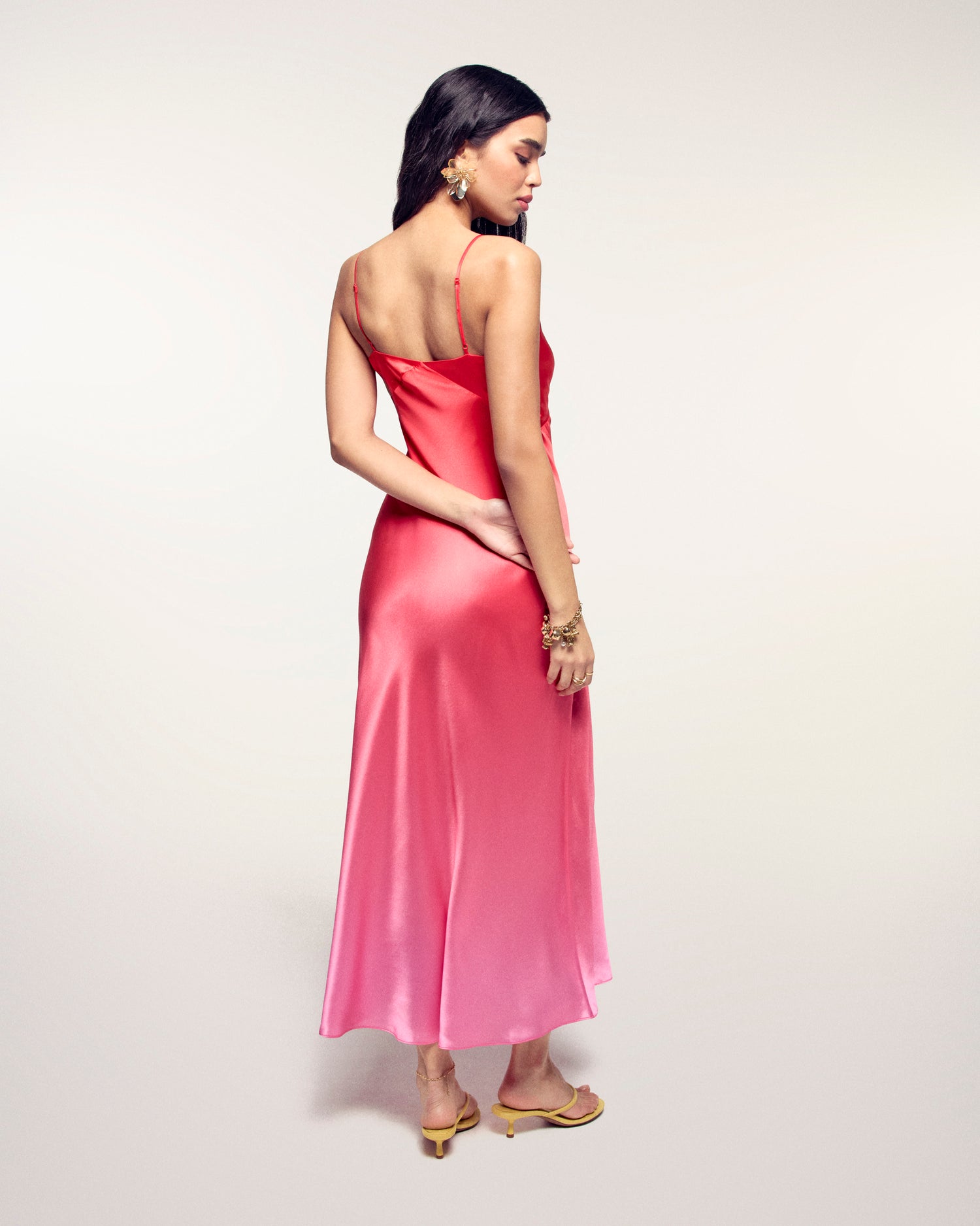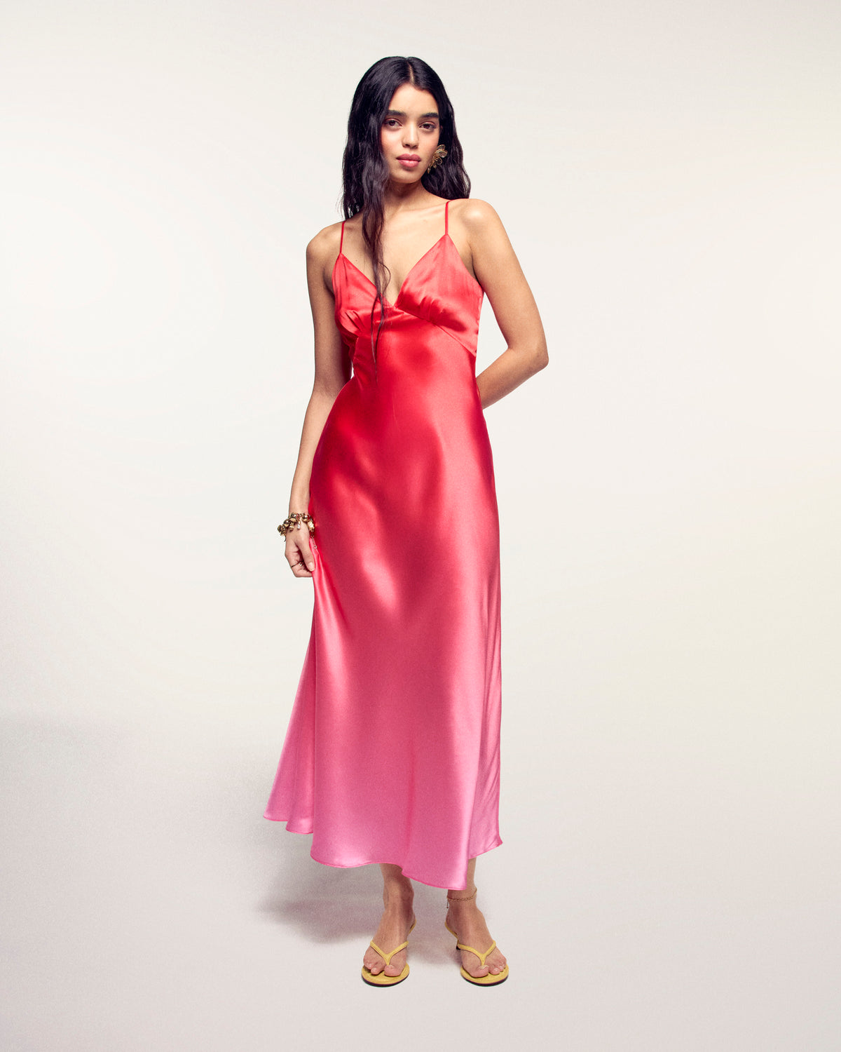 Sonnenhafte Eleganz für Ihre Garderobe mit diesem Maxikleid aus Seidensatin. Der verschwommene Print und die Slim-Fit-Passform kreieren eine stilvolle Silhouette, ergänzt durch einen V-Ausschnitt und verstellbare schmale Träger. Ein fließendes Modell mit ausgestelltem Saum, ideal für einen anspruchsvollen und leichten Look.