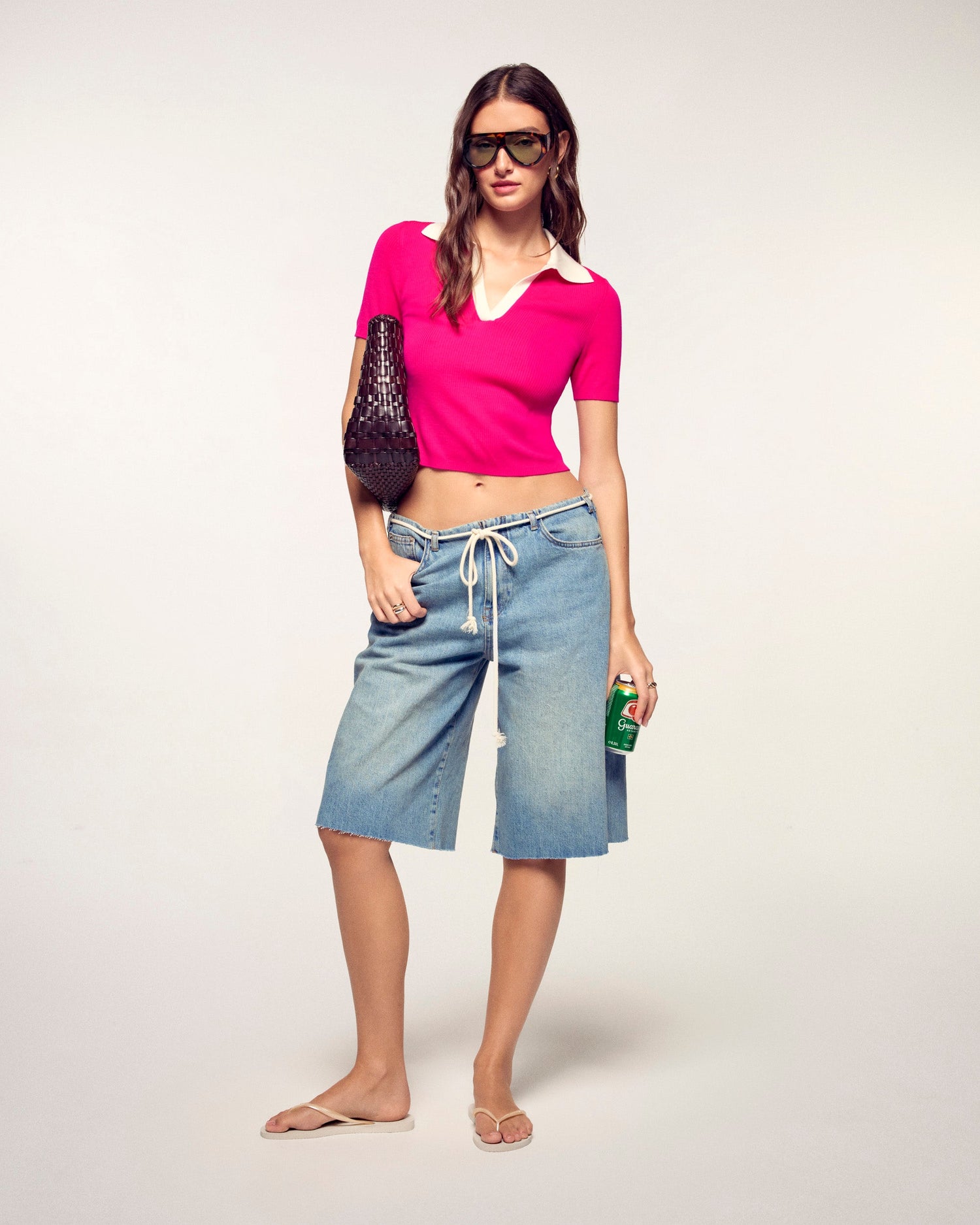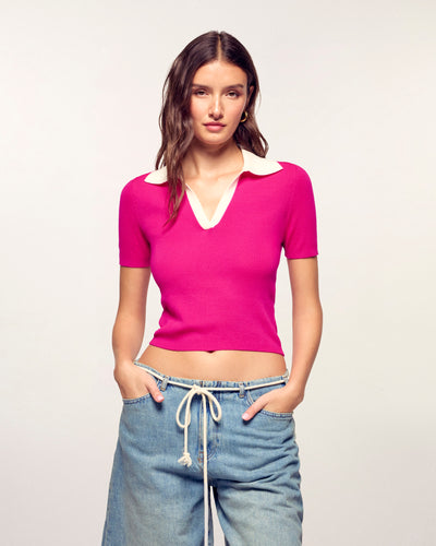 Eine grafische und zweifarbige Silhouette für diesen Kurzpullover aus extrafeiner Merinowolle mit elegantem Polokragen. Er besticht durch seinen kontrastierenden Kragen und den V-Ausschnitt, die diesem neu interpretierten Basic eine moderne und dynamische Note verleihen.
