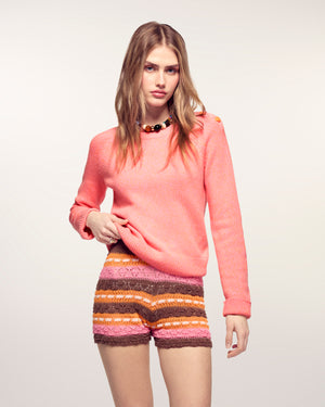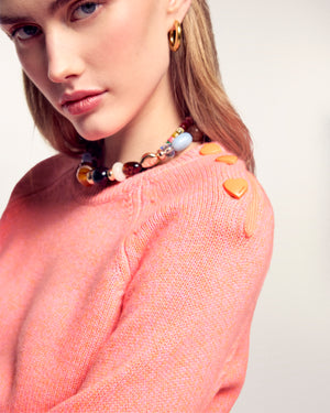 Ein wärmendes Kleidungsstück mit meliertem Finish, ideal um Ihrem Alltag einen Hauch von Weichheit und Fantasie zu verleihen. Dieser Pullover besticht durch seine herzförmigen Knöpfe an der Schulteröffnung, die für eine zugleich moderne und romantische Silhouette sorgen.