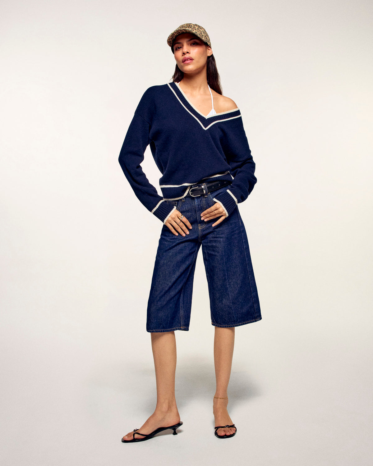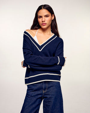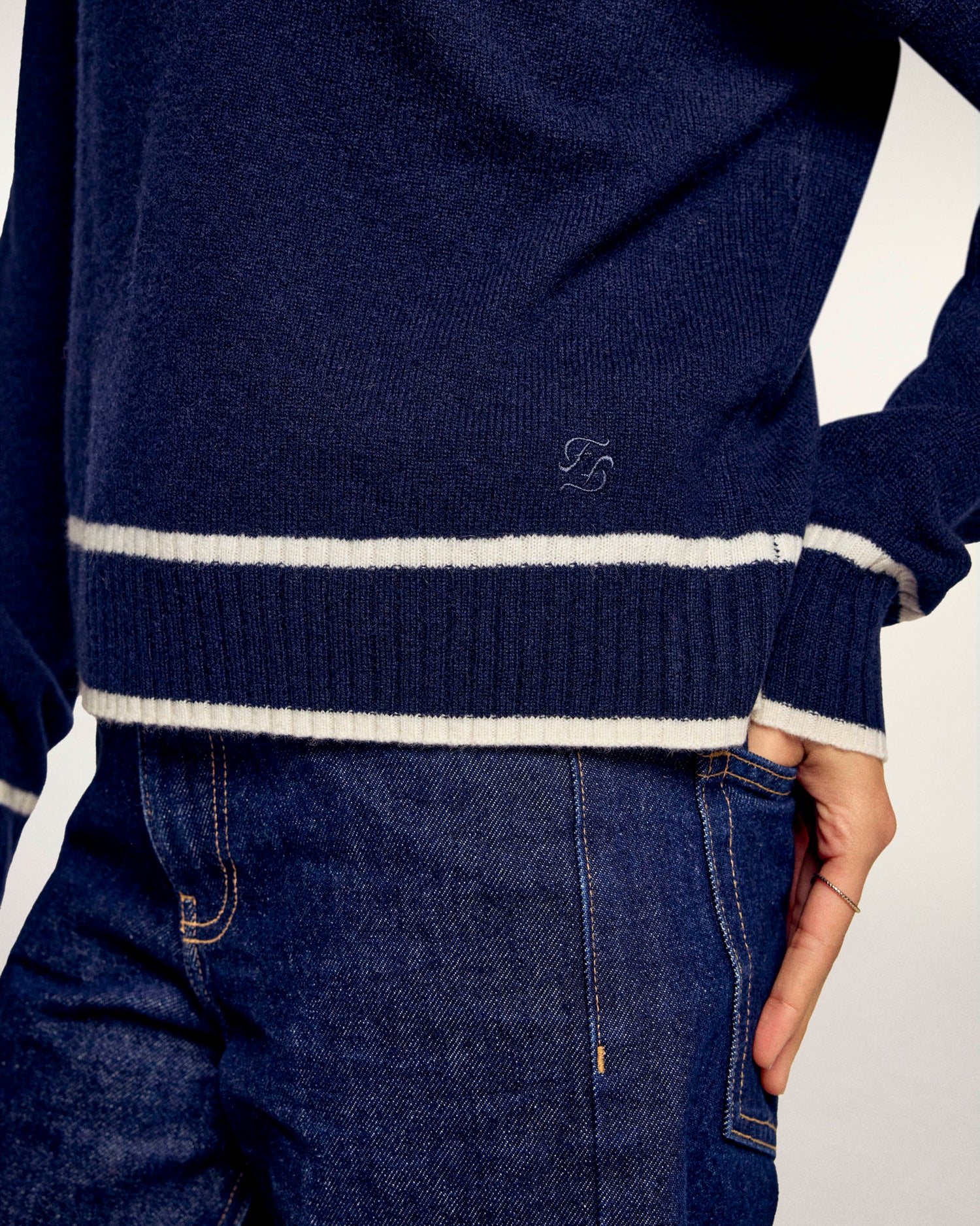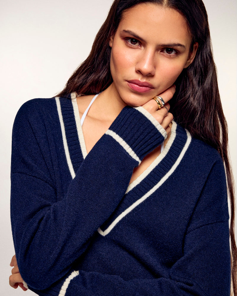 V-Ausschnitt Pullover Kontrastierenden Paspeln - 100% Kaschmir - GCS-verifiziert - Marineblau