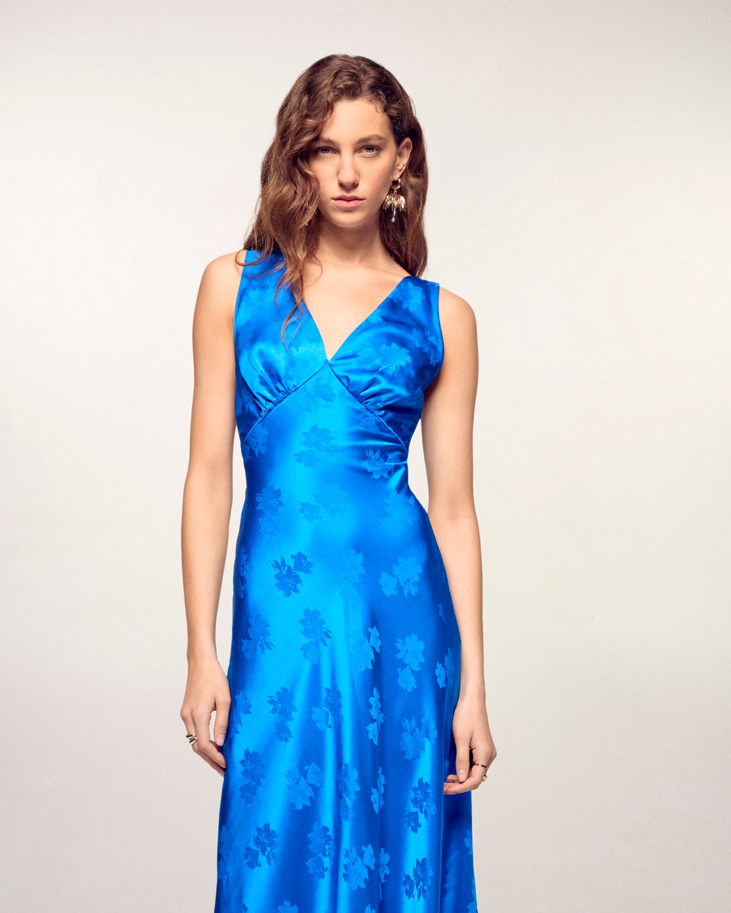 Dieses Maxikleid ist aus Seide mit einer Jacquard-Webung gefertigt. Es weist eine schmale Passform auf und besticht durch seinen tiefen Ausschnitt auf der Vorder- und Rückseite.