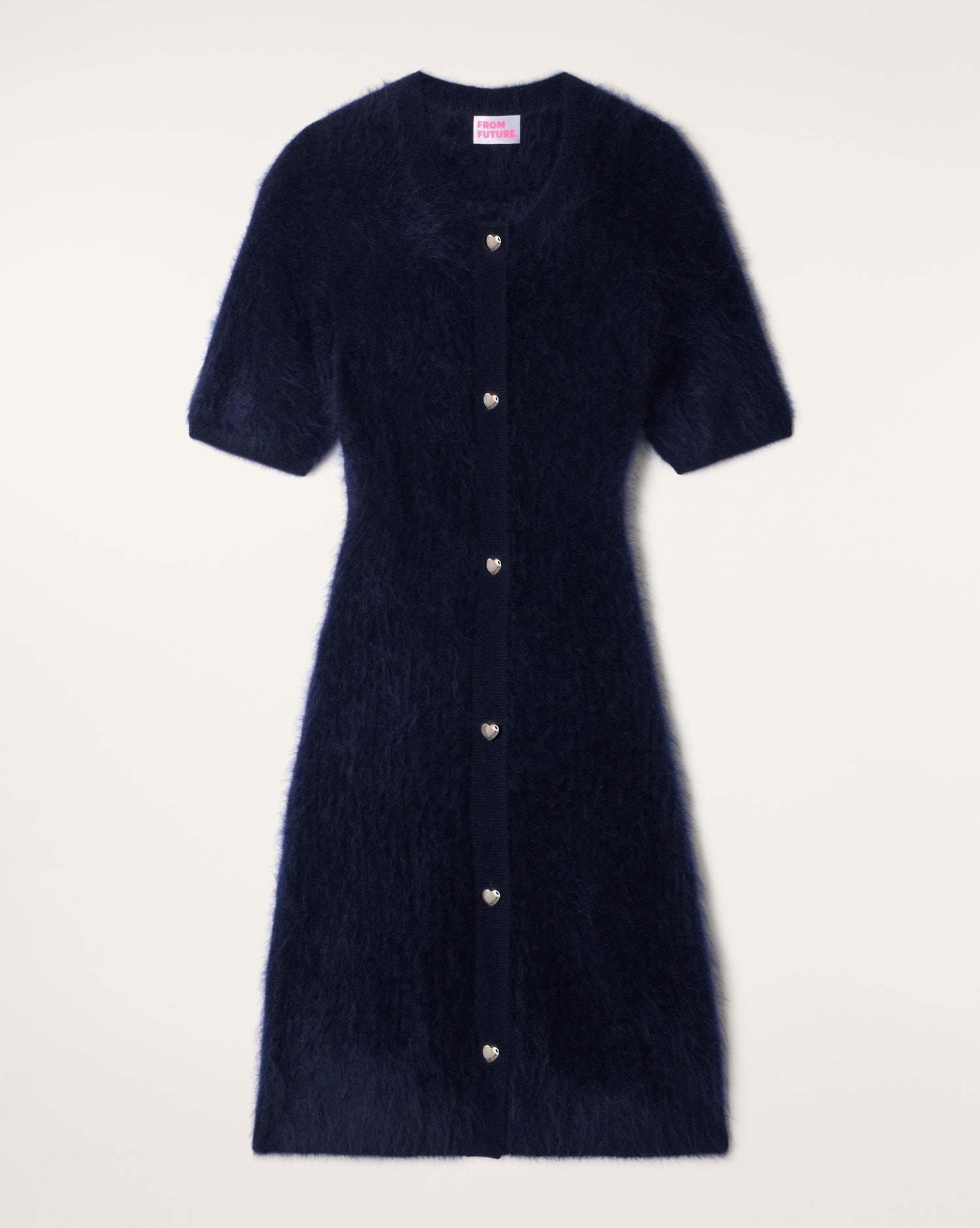 A Kleid Gestrickt mit Retro-Charme, mit seinem strukturierten Volumen, seinen strukturierten Details und seiner Reihe silberner Herzknöpfe, die ihm eine sehr feminine Note verleihen.