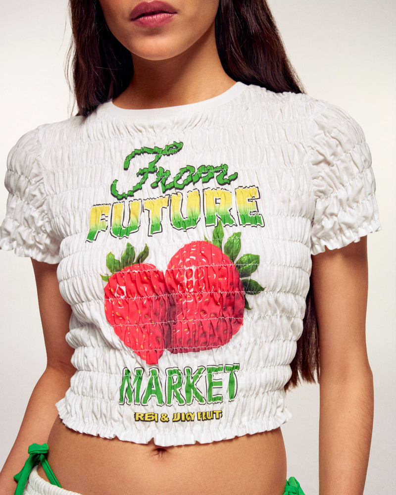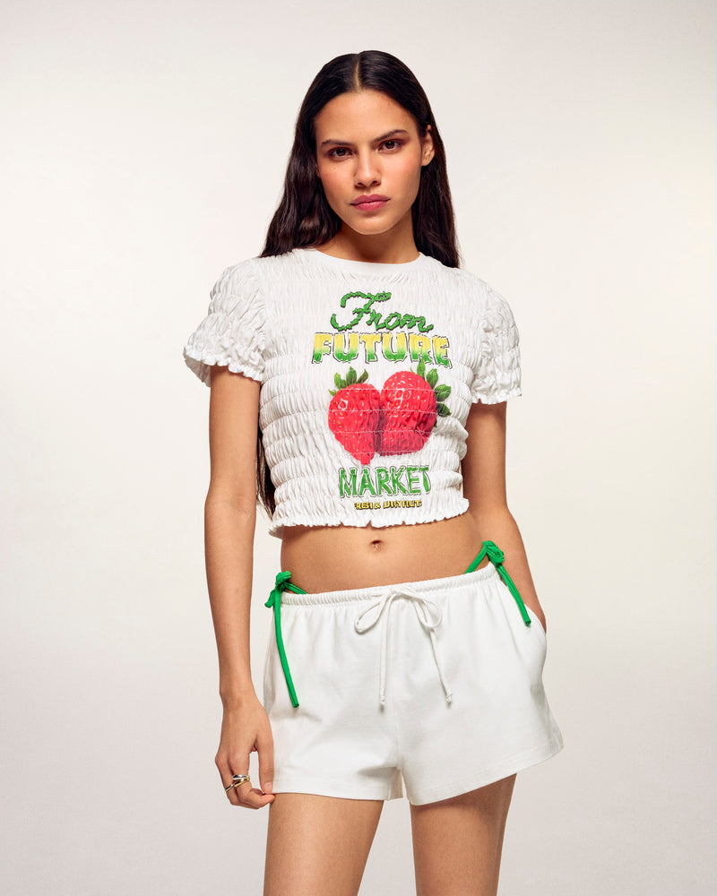 Dieses kurze T-Shirt interpretiert die Streetwear-Codes mit einer originellen Textur neu. Es ist komplett gesmokt und bietet eine schmale, dehnbare Passform, die sich perfekt an die Kurven anschmiegt. Es besticht durch seine „FROM FUTURE MARKET“-Grafik mit einem Erdbeer-Motiv auf der Vorderseite, die Ihrem Outfit eine verspielte und farbenfrohe Note verleiht.