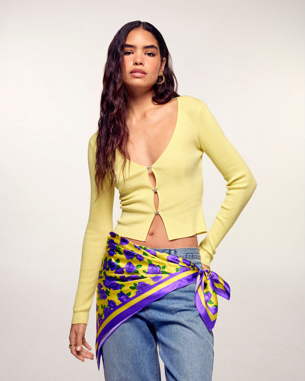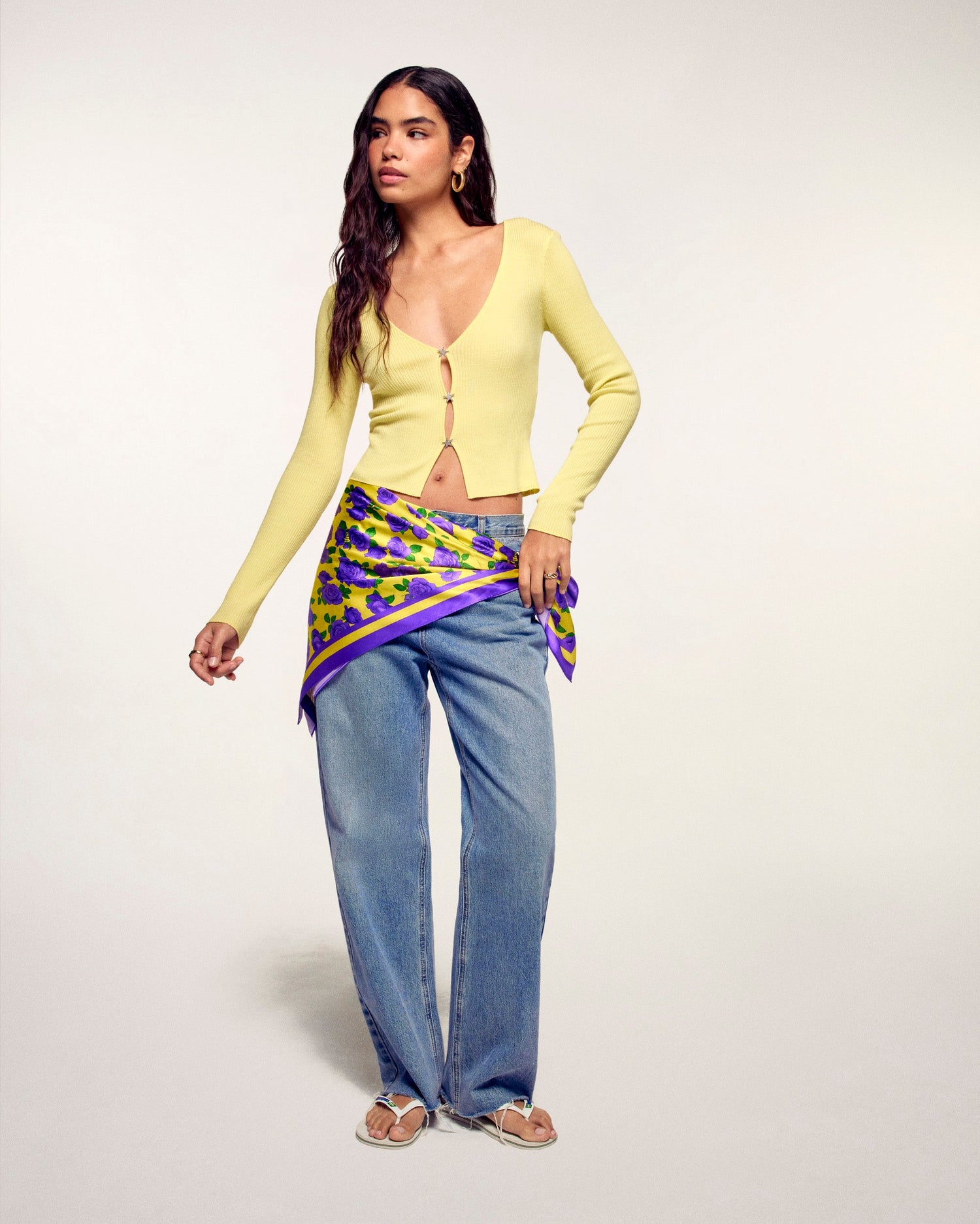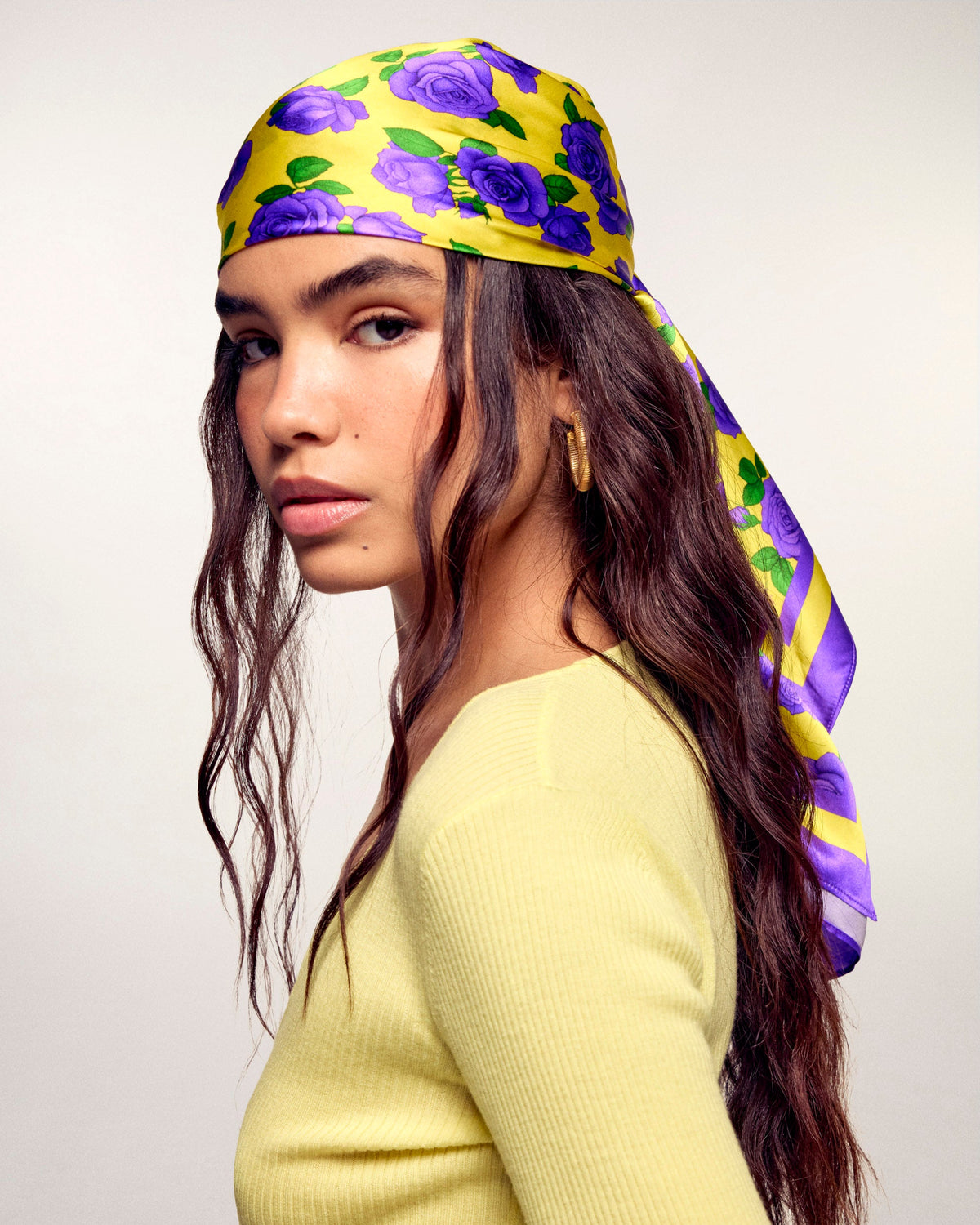 Ein dynamisches und feminines Accessoire, das jede Silhouette perfekt ergänzt. Dieser Schal aus reinem Seidensatin besticht durch einen leuchtenden Blumendruck mit einer breiten, kontrastierenden Bordüre. Sein edles und glänzendes Material bietet einen außergewöhnlich weichen Griff und einen fließenden Fall.