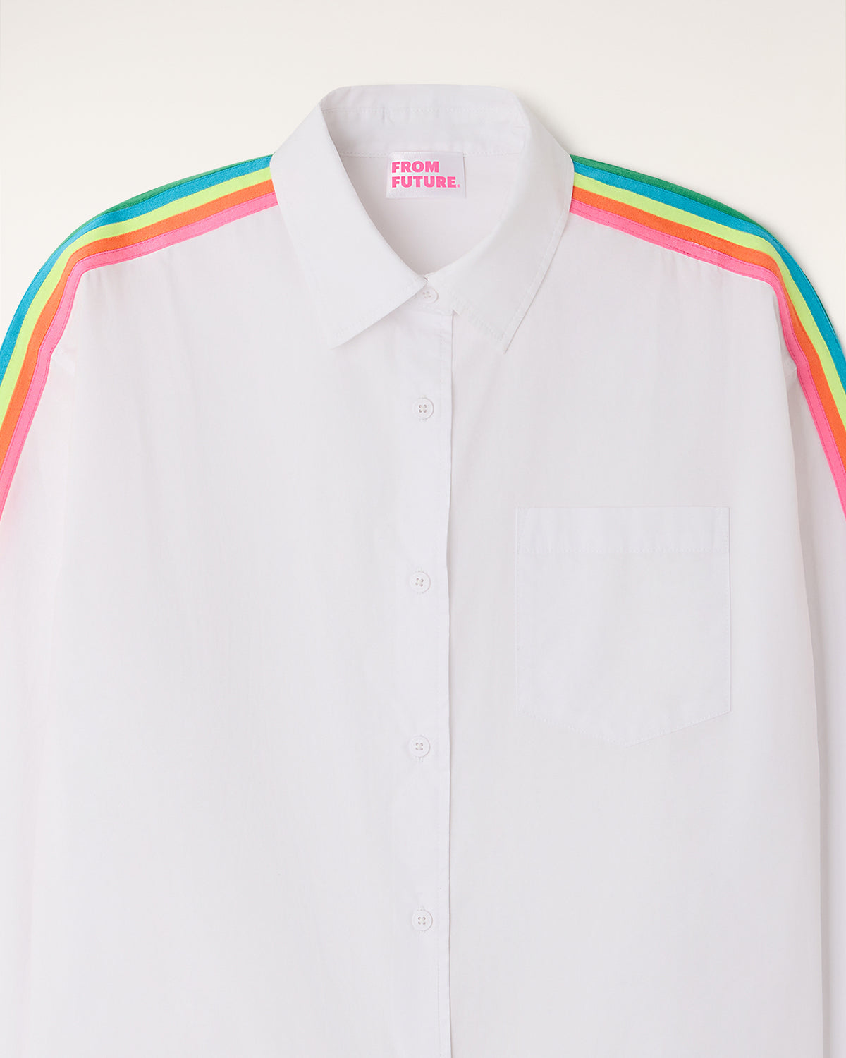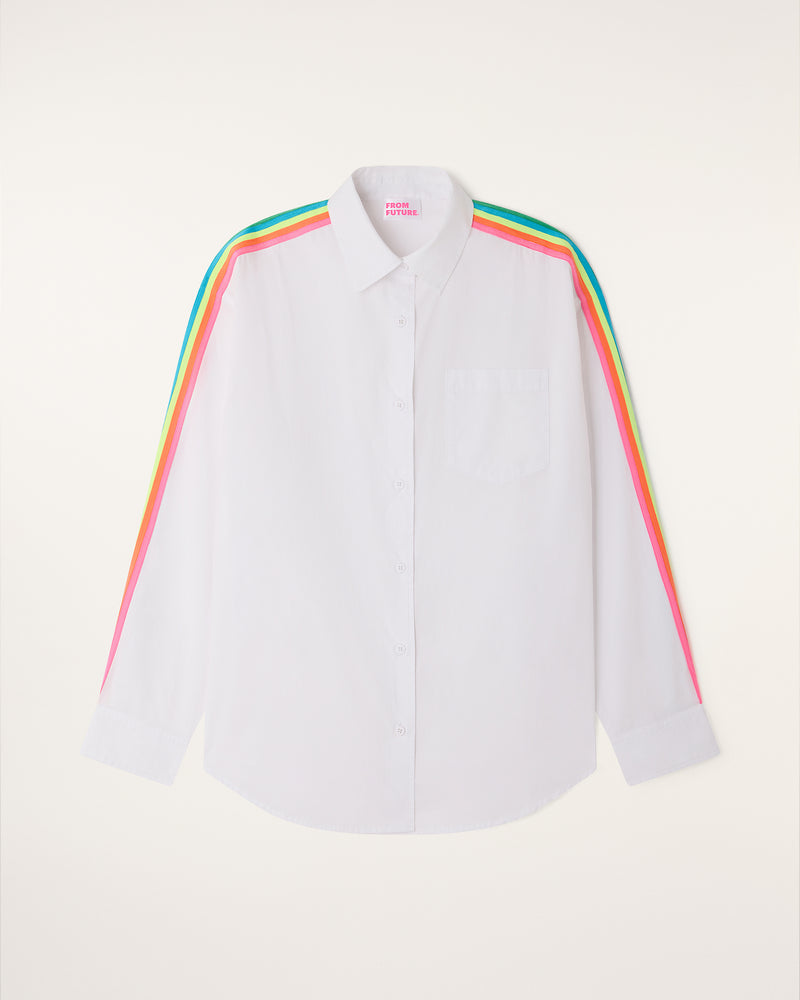 Une pièce lumineuse et dynamique qui revisite les codes de la chemise classique. Confectionnée en popeline de coton, elle se distingue par ses bandes multicolores apposées le long des manches pour une allure graphique et moderne. Sa coupe oversize offre un tombé impeccable et un confort absolu au quotidien.