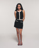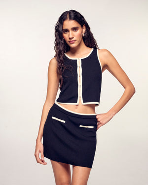 Eine leichte und sonnige Silhouette für diesen kurzen Rock aus Rippstrick, gefertigt aus 100% extrafeiner Merinowolle. Er besticht durch seine kontrastierenden Abschlüsse und die fantasievollen, mit Strass besetzten Knöpfe, die für leuchtende Akzente sorgen.