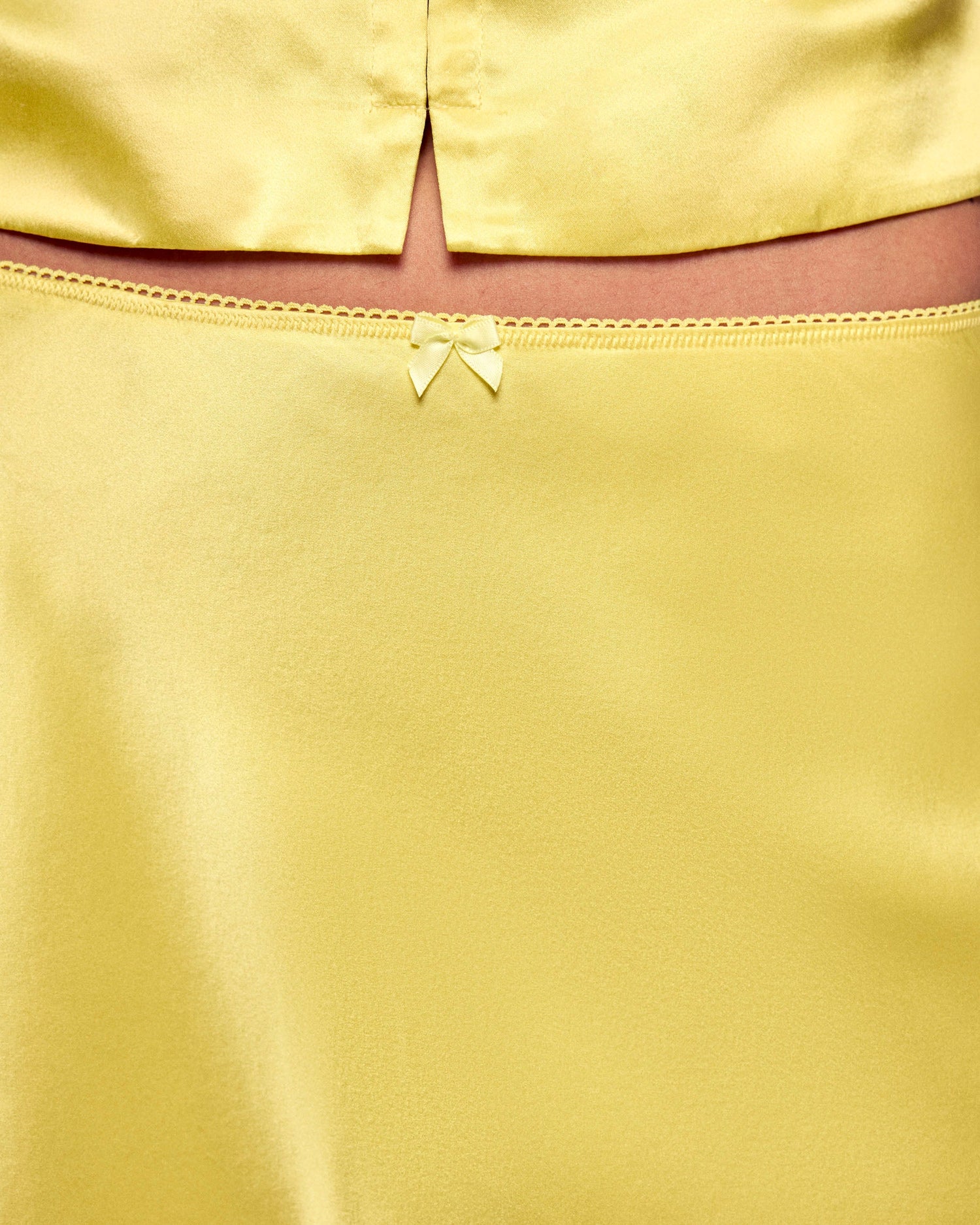 Eine leichte und sonnige Silhouette für diesen Minirock aus Seidensatin. Er zeichnet sich durch sein dezentes Knotendetail am Bund in der vorderen Mitte aus und verleiht Ihren Sommertagen eine ebenso frische wie anspruchsvolle Ausstrahlung.