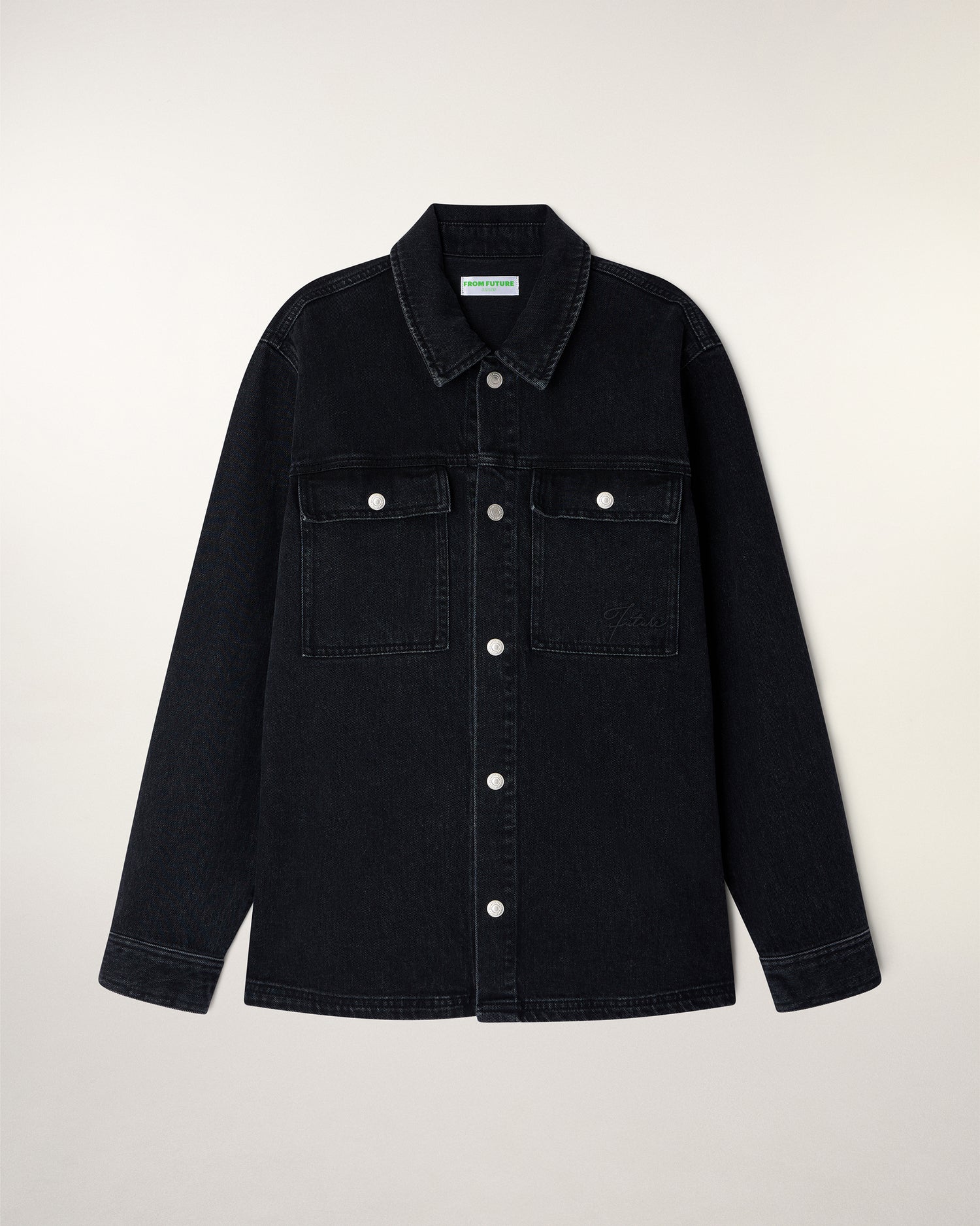 Das ideale Kleidungsstück für die Übergangszeit. Dieses aus Baumwolle gefertigte Überhemd verleiht mit seinem Washed Black-Effekt und seinem strukturierten Schnitt einen schicken Workwear-Touch. Es besticht durch die „Future“-Stickerei und silberne Druckknöpfe für einen kühnen Stil.