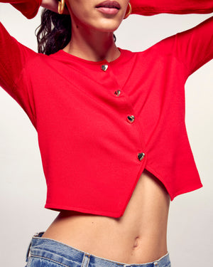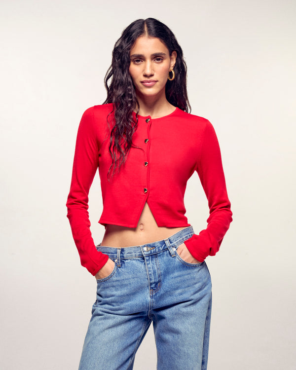 Ein ebenso romantisches wie modernes Kleidungsstück, ideal um Ihre saisonalen Outfits zu vervollständigen. Dieser Cardigan-Pullover aus Merinowolle besticht durch seine goldfarbenen Knöpfe in Herzform, die seiner schlichten Silhouette eine feminine und edle Note verleihen.