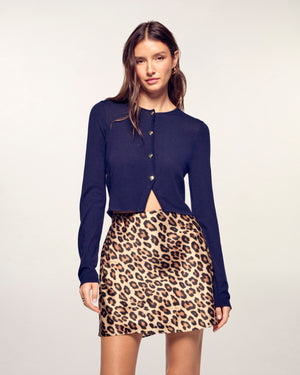 Ein ebenso romantisches wie modernes Kleidungsstück, ideal um Ihre saisonalen Outfits zu vervollständigen. Dieser Cardigan-Pullover aus Merinowolle besticht durch seine goldfarbenen Knöpfe in Herzform, die seiner schlichten Silhouette eine feminine und edle Note verleihen.