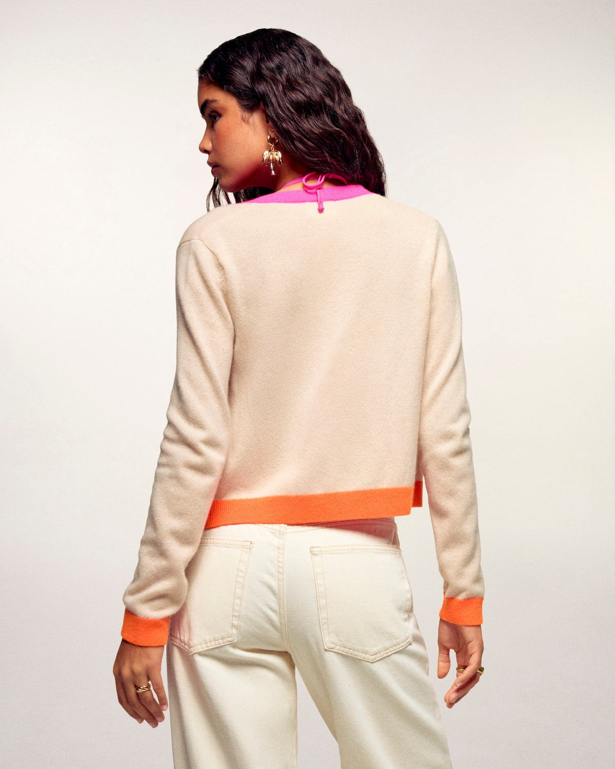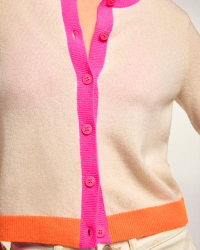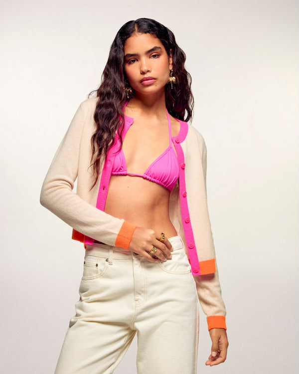 Ein weicher und ultraleichter Strick für diesen kurz geschnittenen Cardigan-Pullover aus Kaschmir. Akzentuiert durch kontrastierende Abschlüsse an Kragen, Saum und Ärmelbündchen, zeigt er einen grafischen und absolut modernen Look. Ein unverzichtbares Essential, das für einen mühelosen Look direkt auf der Haut getragen werden kann.