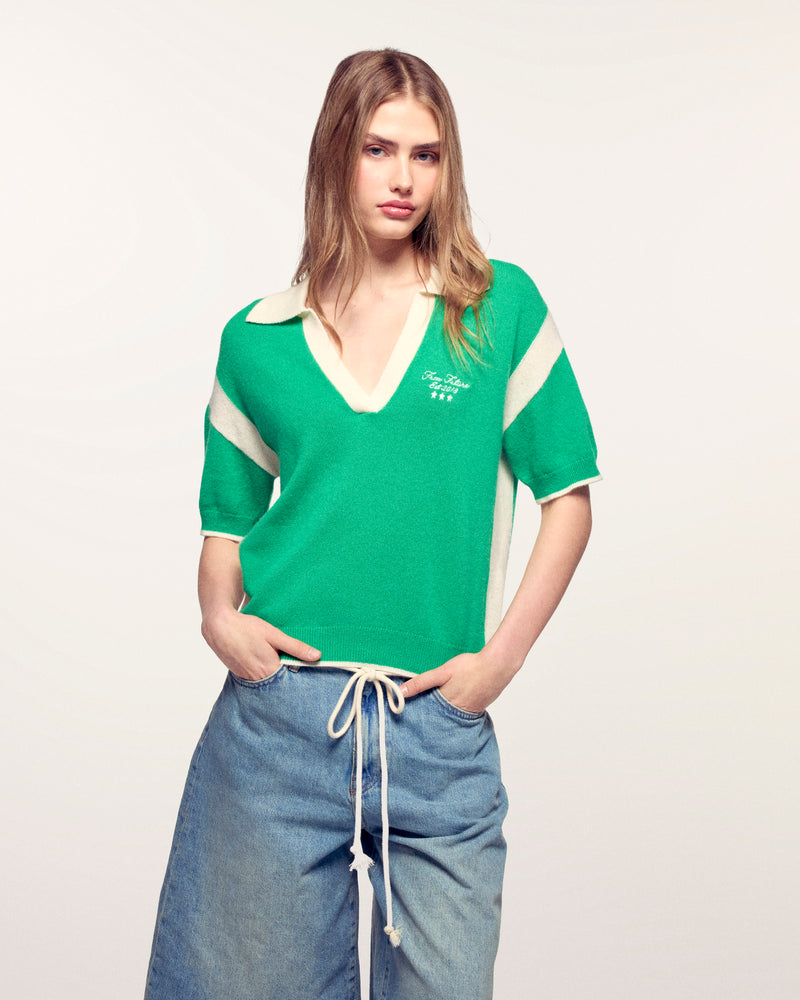 Das neu interpretierte Strick-Poloshirt mit einem Hauch Sportswear. Dieser aus Kaschmir 2 Fäden gefertigte Pullover bietet ideale Weichheit und Leichtigkeit. Seine zeitlose normale Passform wird durch einen großen kontrastierenden V-Polo-Kragen und Kettenstich-Stickereien, dem Markenzeichen der Brand, geprägt.