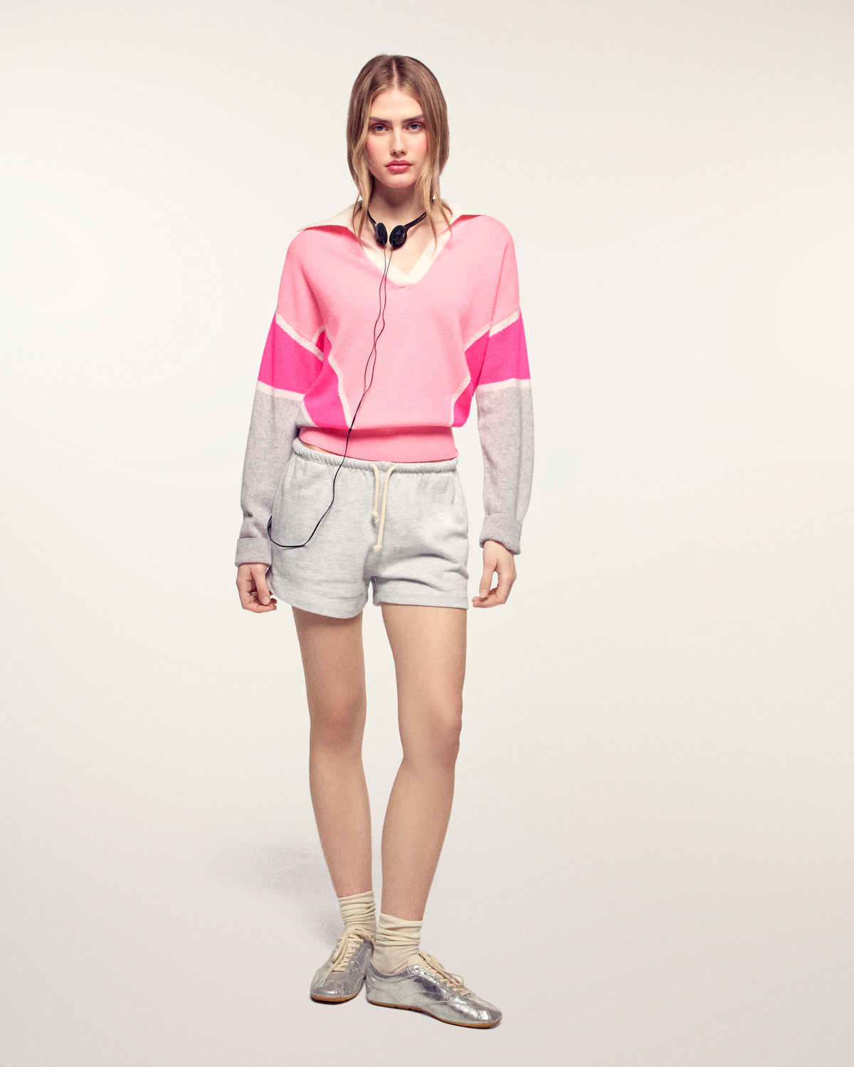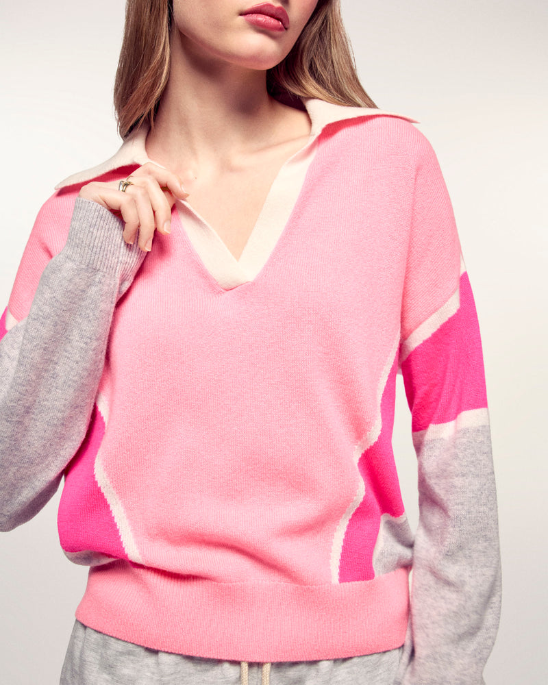 Ein grafisches Kleidungsstück mit entschlossen modernem Stil, ideal um Ihre saisonale Garderobe zu dynamisieren. Dieser Kaschmirpullover besticht durch seinen offenen Polokragen und seine kontrastierenden Einsätze an den Ärmeln und am Körper, was ihm einen markanten Sport-Chic-Look verleiht.