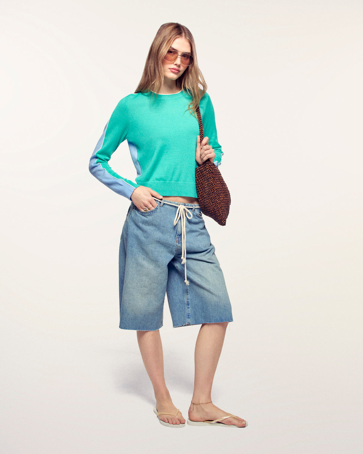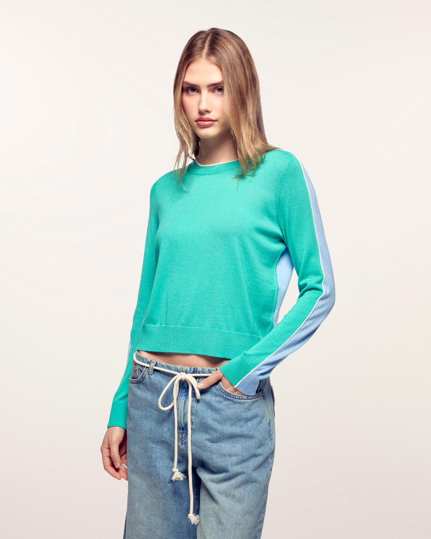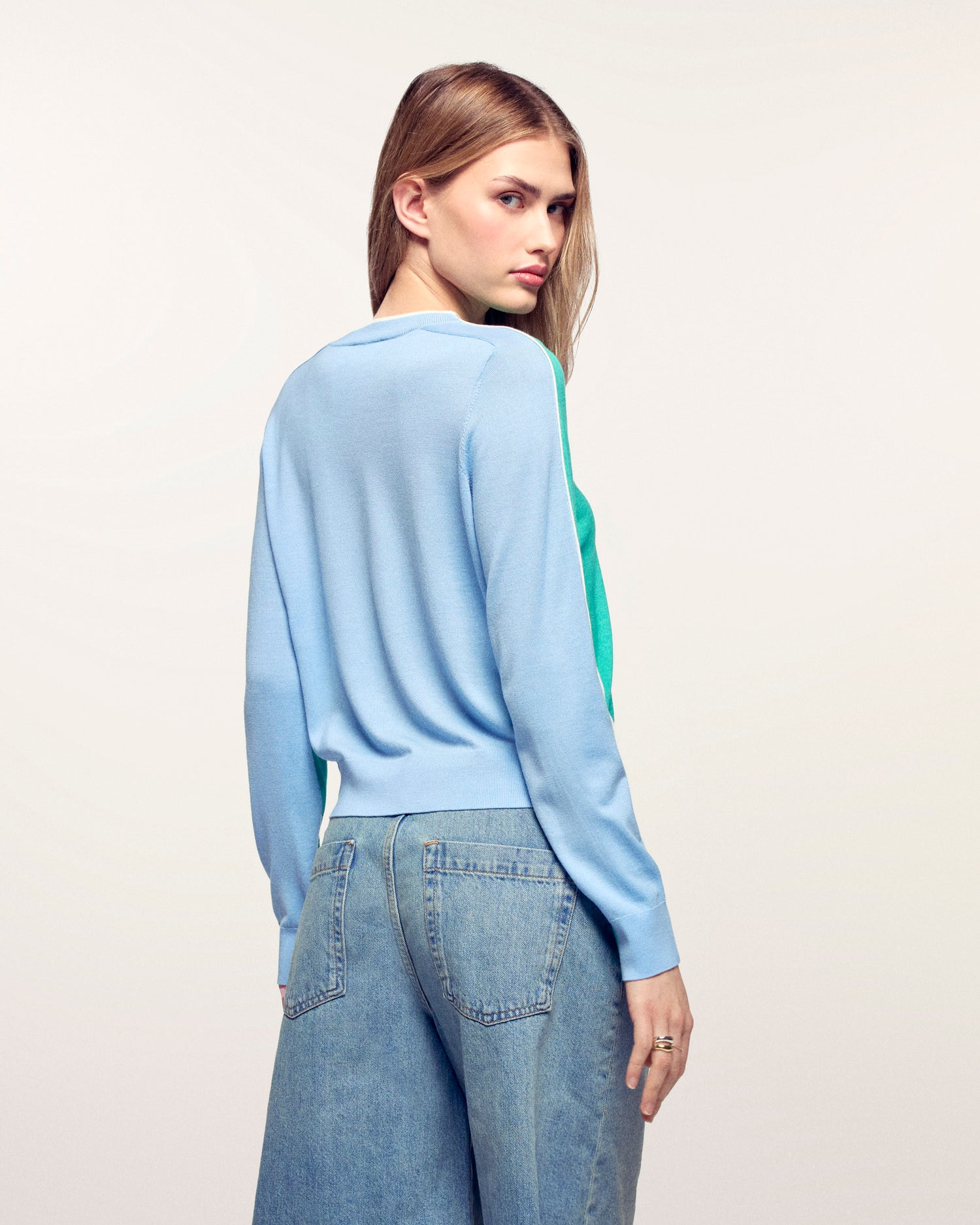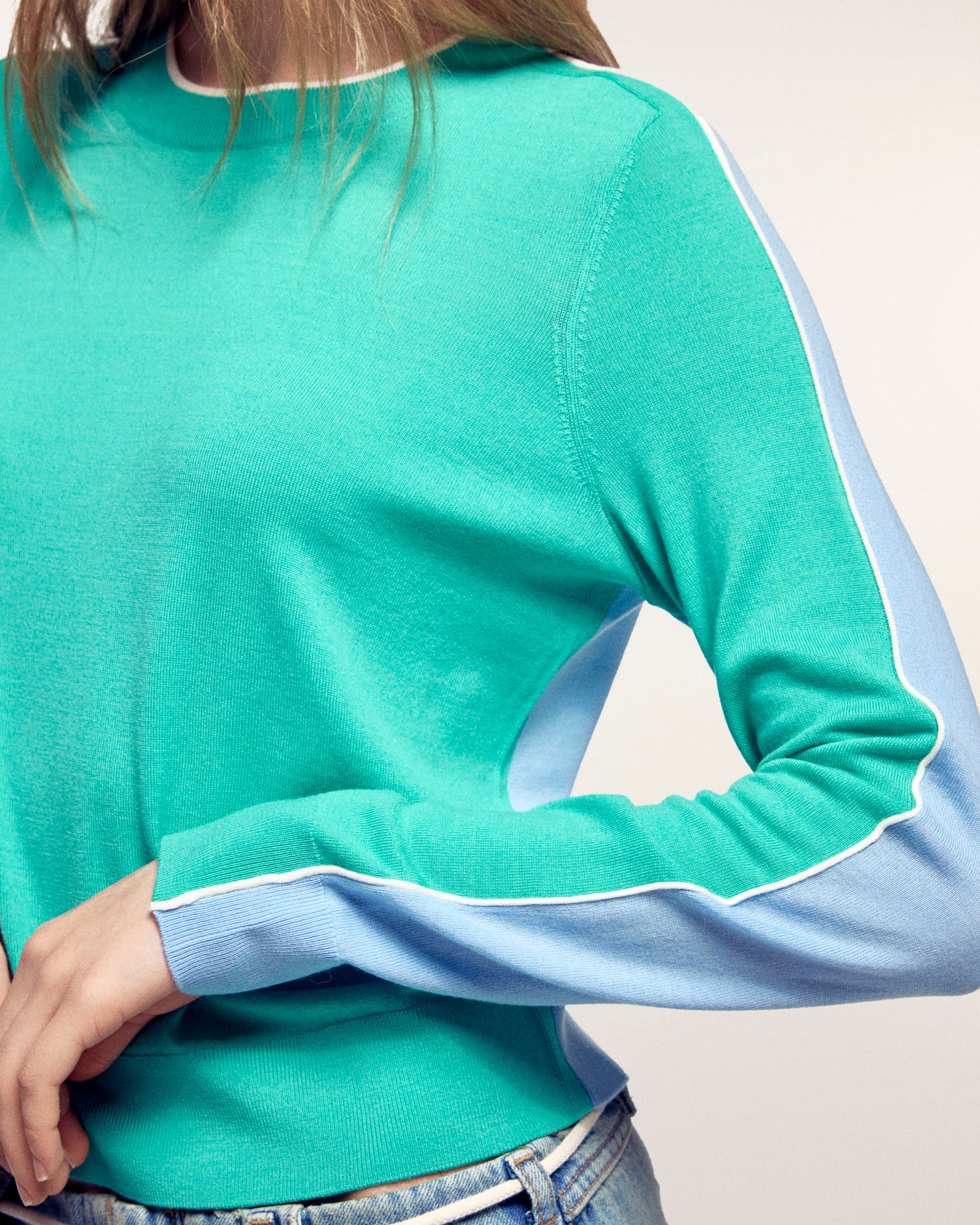 Der ultra-lebendige Color-Block-Pullover. Dieser aus Extrafine Merinowolle 2 Fäden gefertigte Pullover bietet einen weichen und leichten Strick. Seine normale Passform und seine dreifarbige Konstruktion werden durch Kontraststreifen an den Ärmeln und am Kragen in einer dritten Farbe unterstrichen, was für einen sportlich-schicken Grafik-Effekt sorgt.