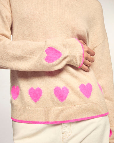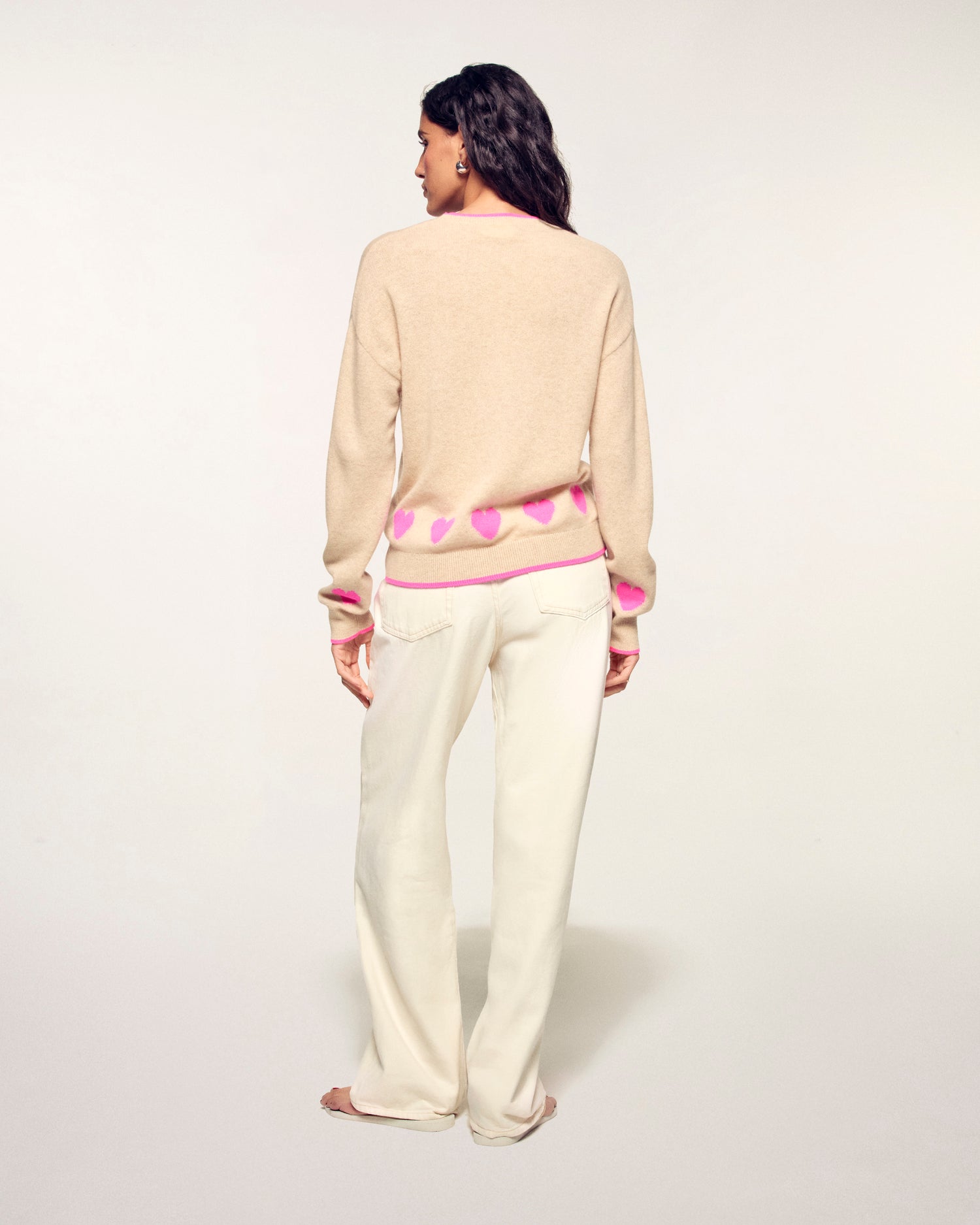 Ein weiches und romantisches Kleidungsstück, das Ihrer Garderobe einen Hauch von Zärtlichkeit verleiht. Dieser Pullover aus leichtem Kaschmir besticht durch seine kontrastierenden Herzmotive am Saum und seine zarten Paspeln, die für eine feminine und moderne Silhouette sorgen.