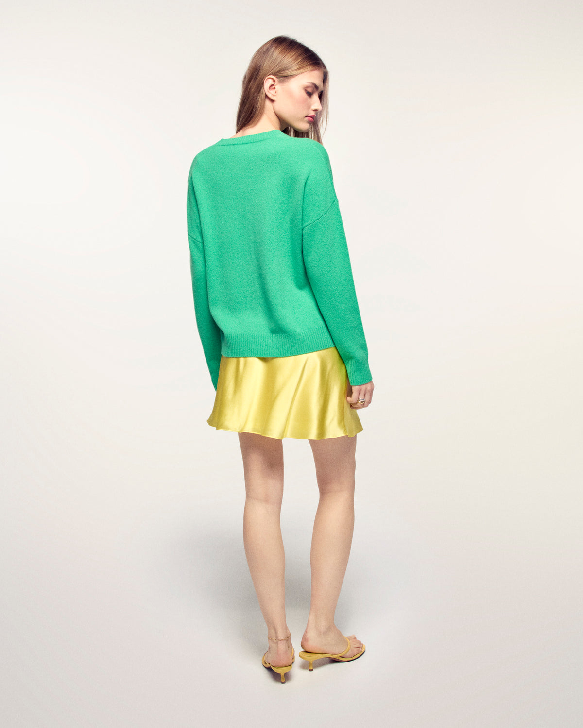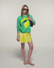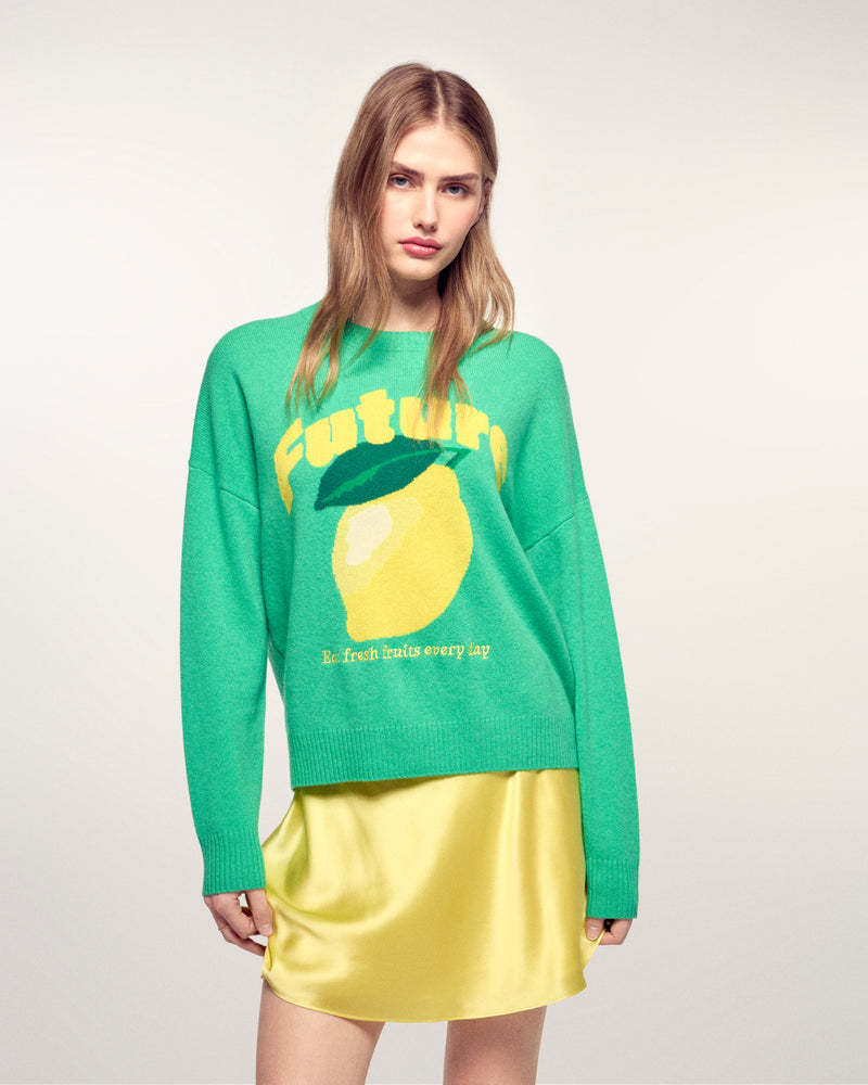 Der genussvolle Pullover. Dieser aus Kaschmir 2 Fäden gefertigte Pullover bietet einen weichen und leichten Strick. Seine Oversize-Passform wird durch ein großes Zitronen-Intarsien-Motiv, begleitet von den Schriftzügen „Future“ und „Eat fresh fruits every day“, dynamisiert.