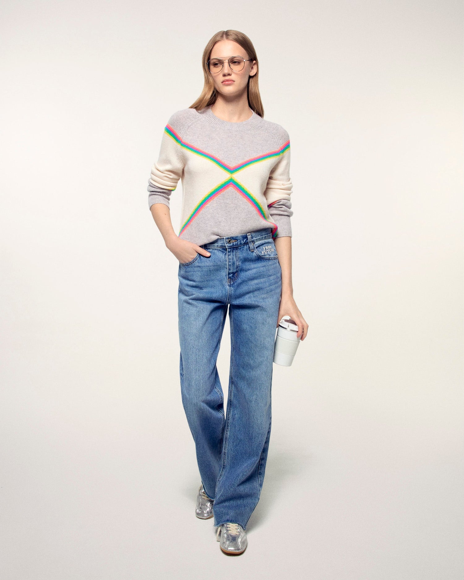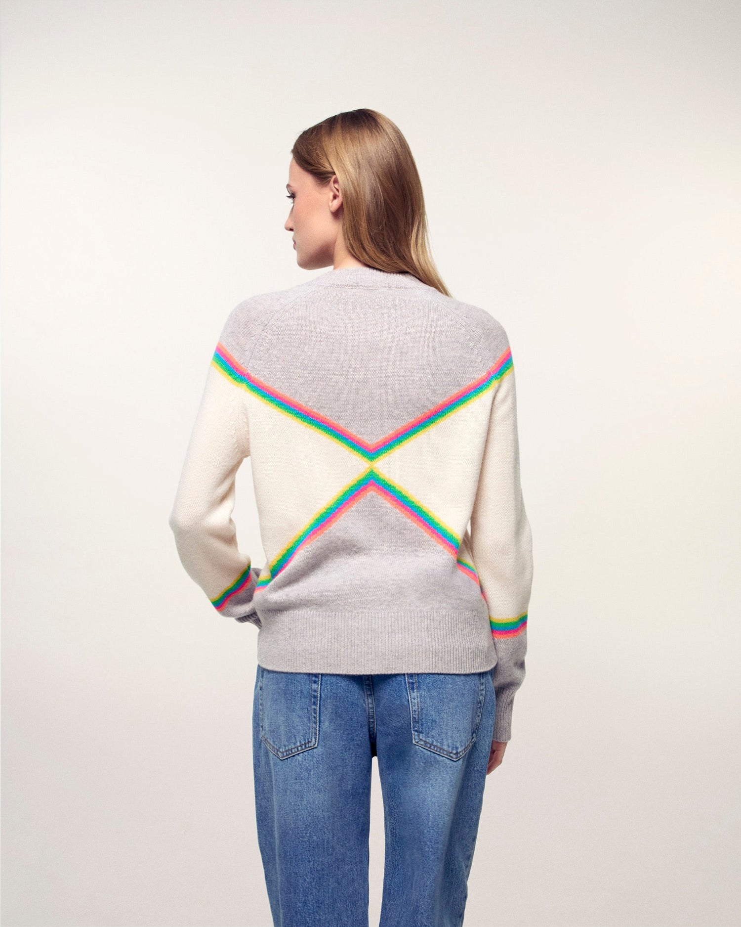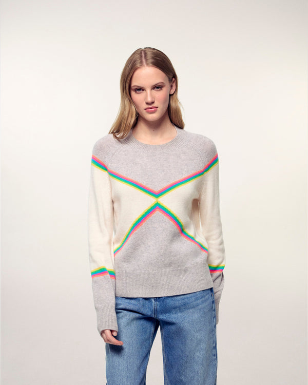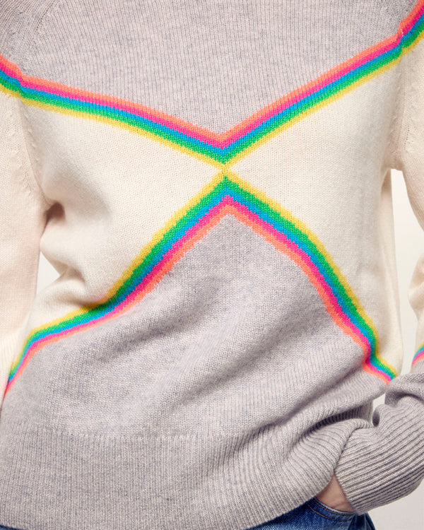 Der Pullover, der Ihrem Look einen poppigen und grafischen Touch verleiht. Dieser aus Kaschmir 2 Fäden gefertigte Pullover bietet einen weichen und leichten Strick. Seine zeitlose normale Passform wird durch ein großes zentrales gekreuztes Fischgrätmuster dynamisiert, das durch kontrastierende bunte Streifen im Regenbogen-Stil unterstrichen wird.