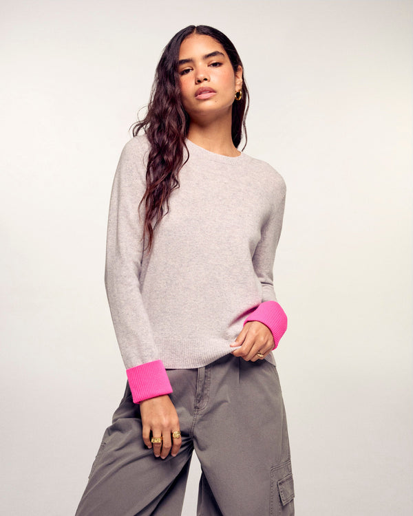 Ein elegant neu interpretierter Klassiker: Dieser Rundhalspullover ist aus reinem 2-fäden Kaschmir gefertigt. Er besticht durch seine kontrastierenden zweifarbigen Abschlüsse an Ausschnitt, Ärmelbündchen und Saum, die seiner körpernahen Silhouette eine grafische und moderne Note verleihen. Ein Stück von außergewöhnlicher Weichheit, ideal für einen raffinierten Alltag.