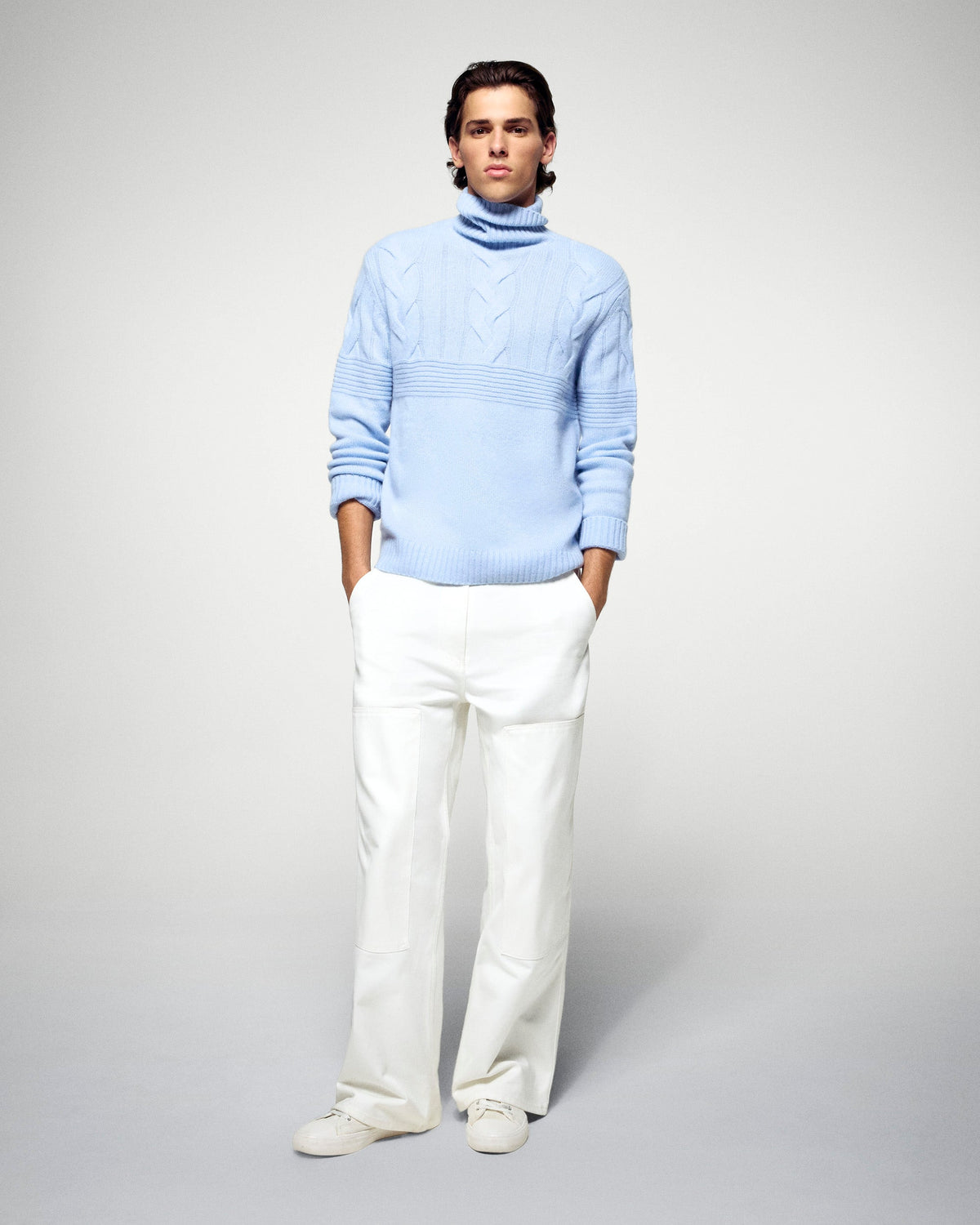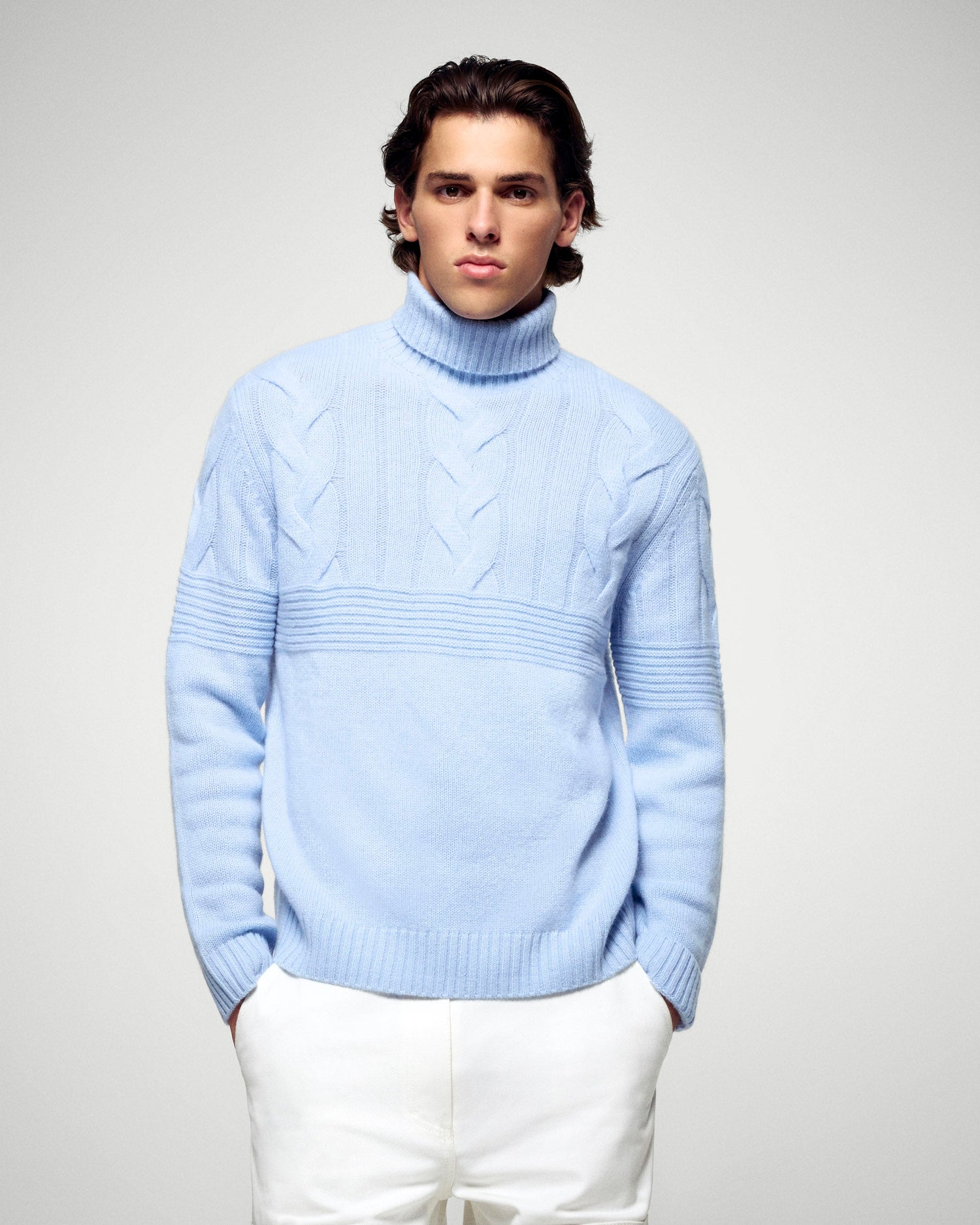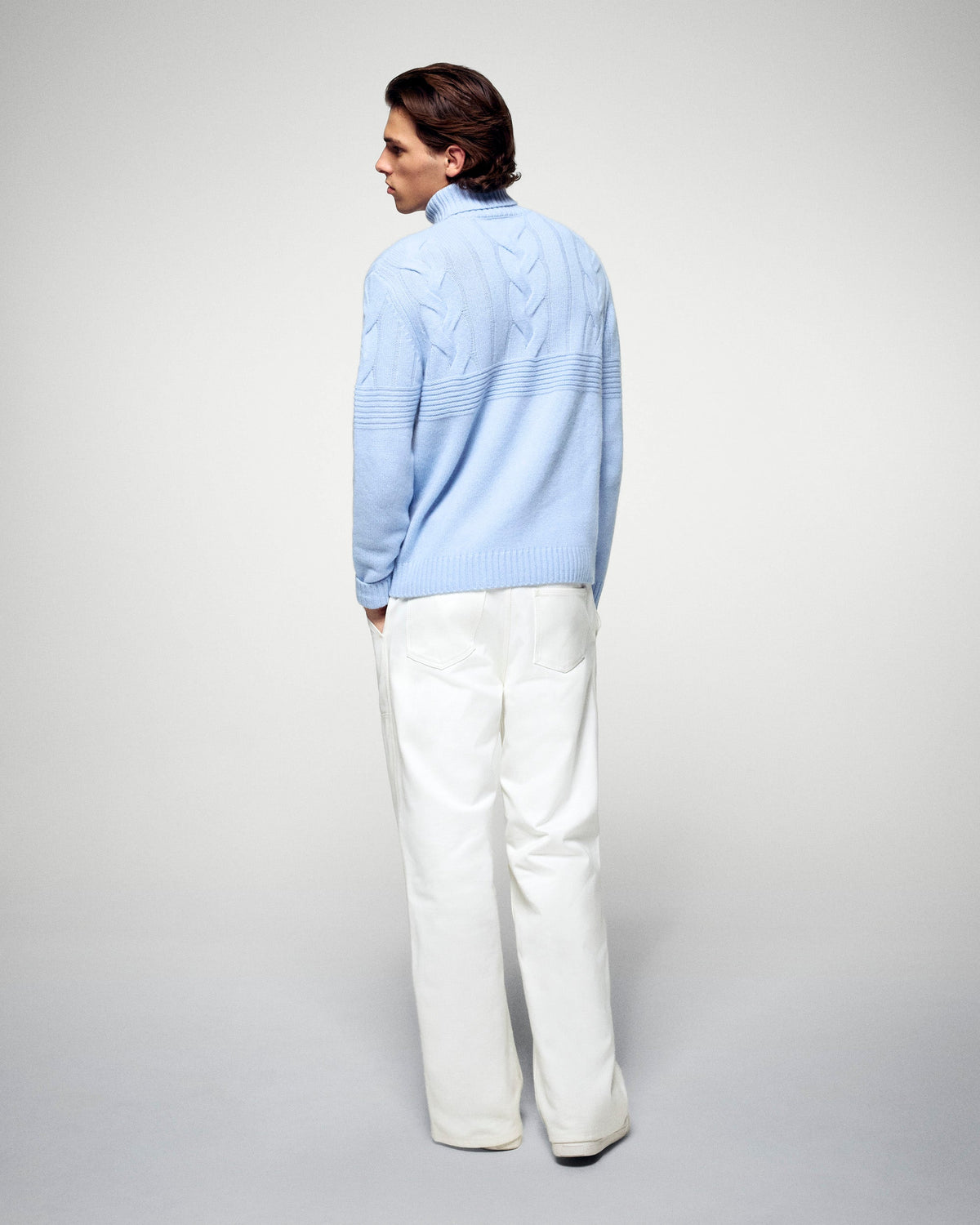 Dieser Pullover aus Kaschmir zeichnet sich durch ein feines Zopfmuster aus. Mit Rollkragen, langen Ärmeln und gerippten Abschlüssen sorgt er für eine elegante und zeitlose Silhouette. Strukturieren Sie Ihre Silhouette, indem Sie ihn mit einer geraden Hose und Sneakers kombinieren.