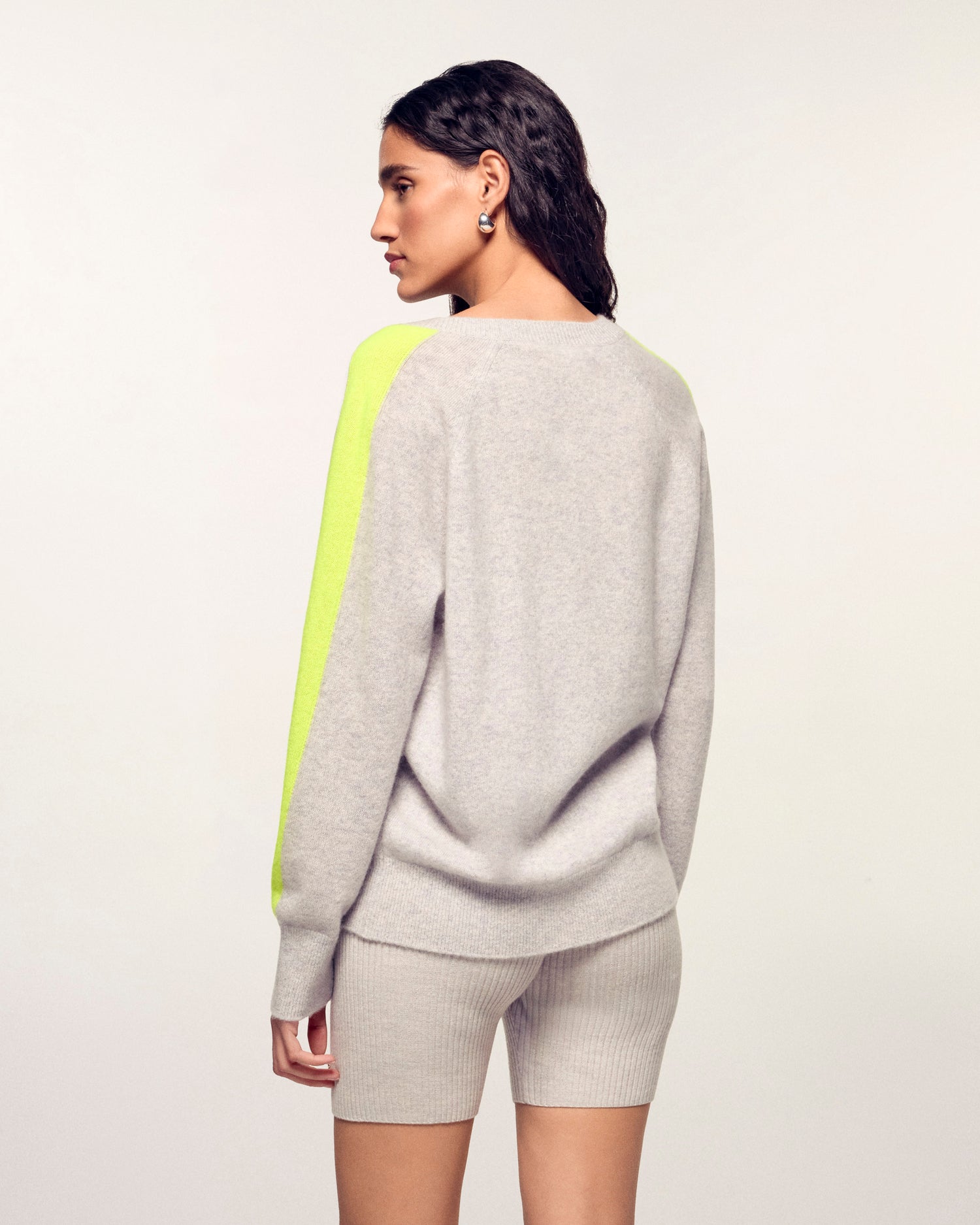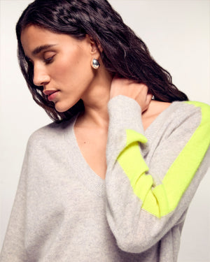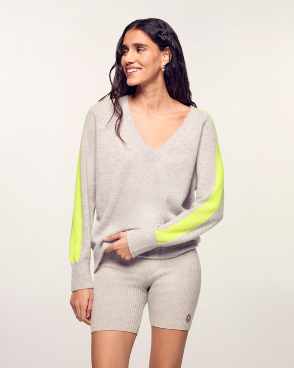 Dieser leichte Strickpullover aus 2-fädigem Kaschmir hat einen kurzen Oversize-Schnitt. Er hat gerippte Abschlüsse, einen V-Ausschnitt und zweifarbige Streifen an den Ärmeln, die die Silhouette elegant und mühelos strukturieren. Kombinieren Sie ihn mit einem Satinrock oder einer lässigen Jeans.