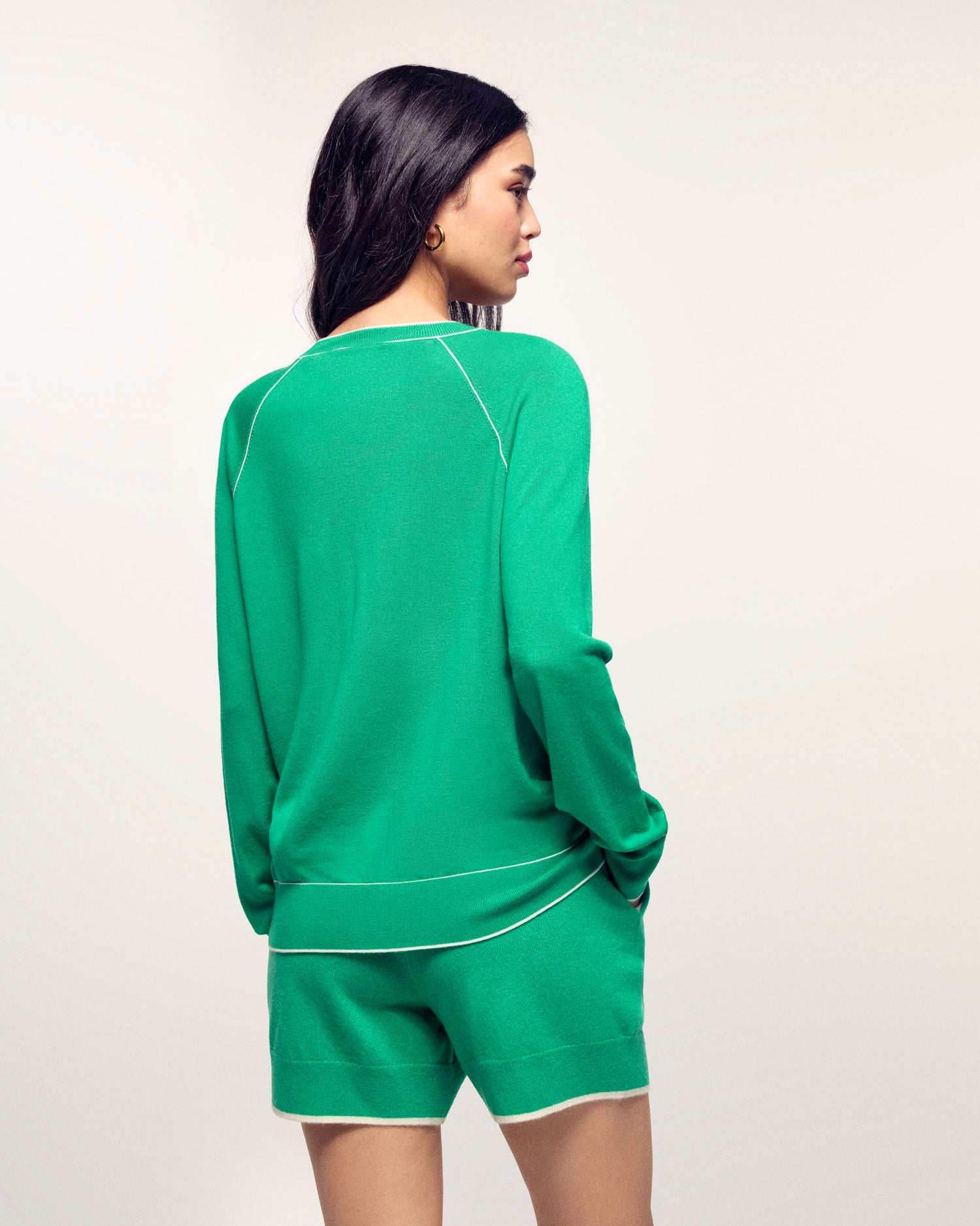 Der V-Ausschnitt-Pullover, der Ihr Outfit veredelt. Dieser aus Extrafine Merinowolle 2 Fäden gefertigte Pullover bietet einen weichen und leichten Strick. Seine zeitlose normale Passform wird durch Kontrastpaspeln dynamisiert, die den Kragen einrahmen, die Raglan-Ärmel betonen und die Rippbündchen abschließen.
