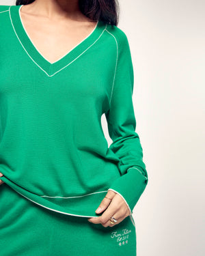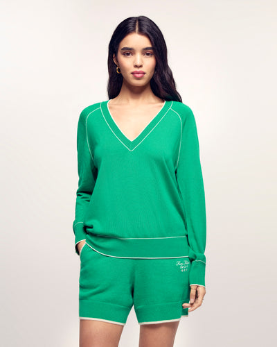 Der V-Ausschnitt-Pullover, der Ihr Outfit veredelt. Dieser aus Extrafine Merinowolle 2 Fäden gefertigte Pullover bietet einen weichen und leichten Strick. Seine zeitlose normale Passform wird durch Kontrastpaspeln dynamisiert, die den Kragen einrahmen, die Raglan-Ärmel betonen und die Rippbündchen abschließen.