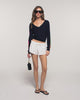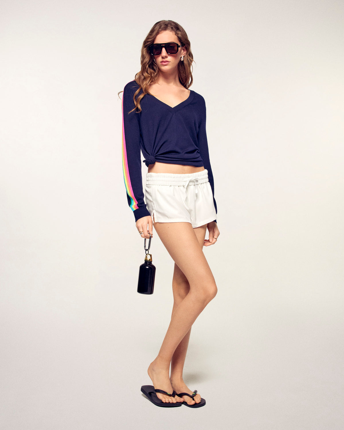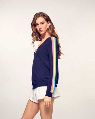 Einer unserer ikonischen Streifenpullover, gefertigt aus Merinowolle und mit einem eleganten V-Ausschnitt versehen. Er besticht durch seine charakteristischen mehrfarbigen Streifen entlang der Ärmel, die diesem unverzichtbaren Basic eine grafische und moderne Note verleihen.