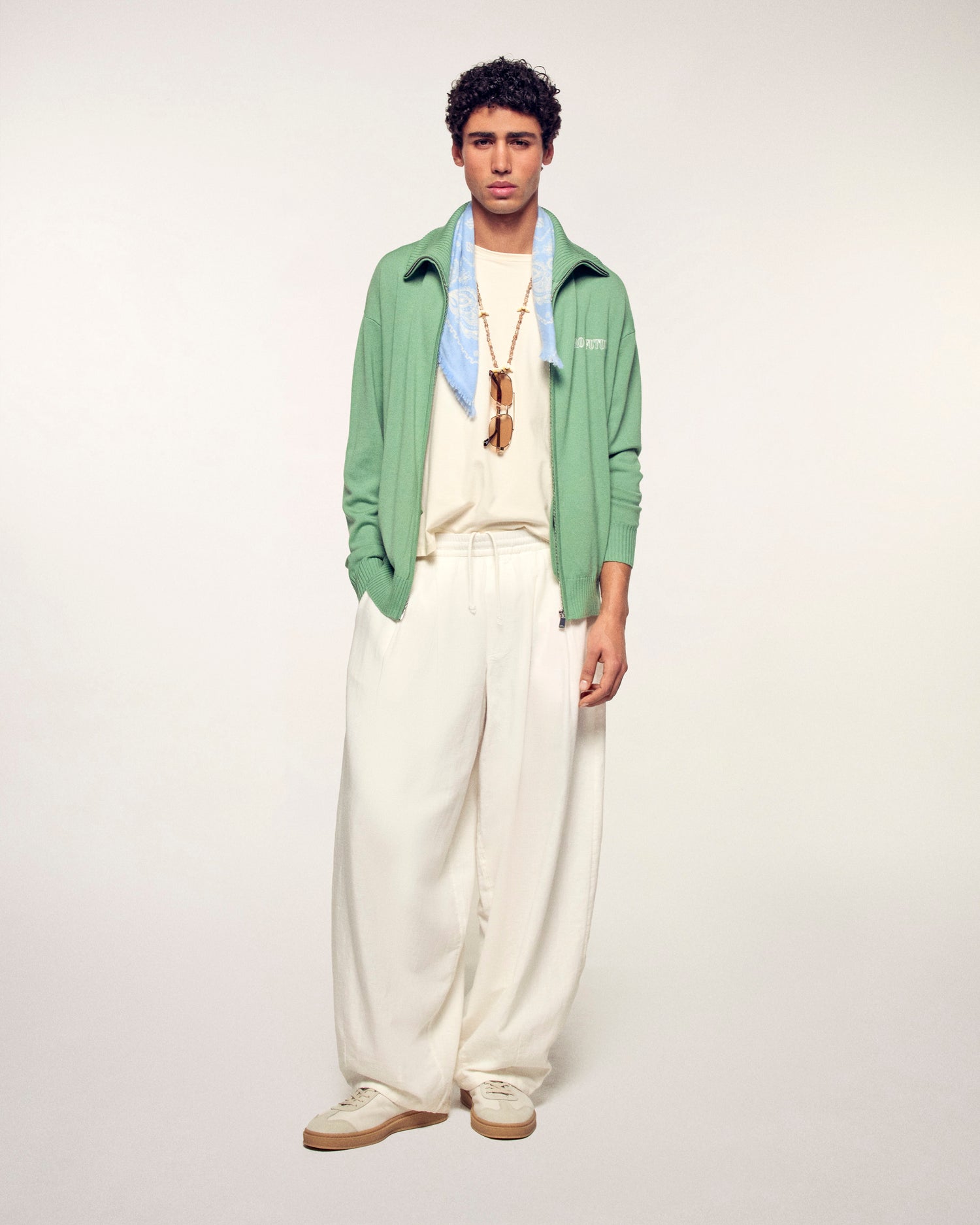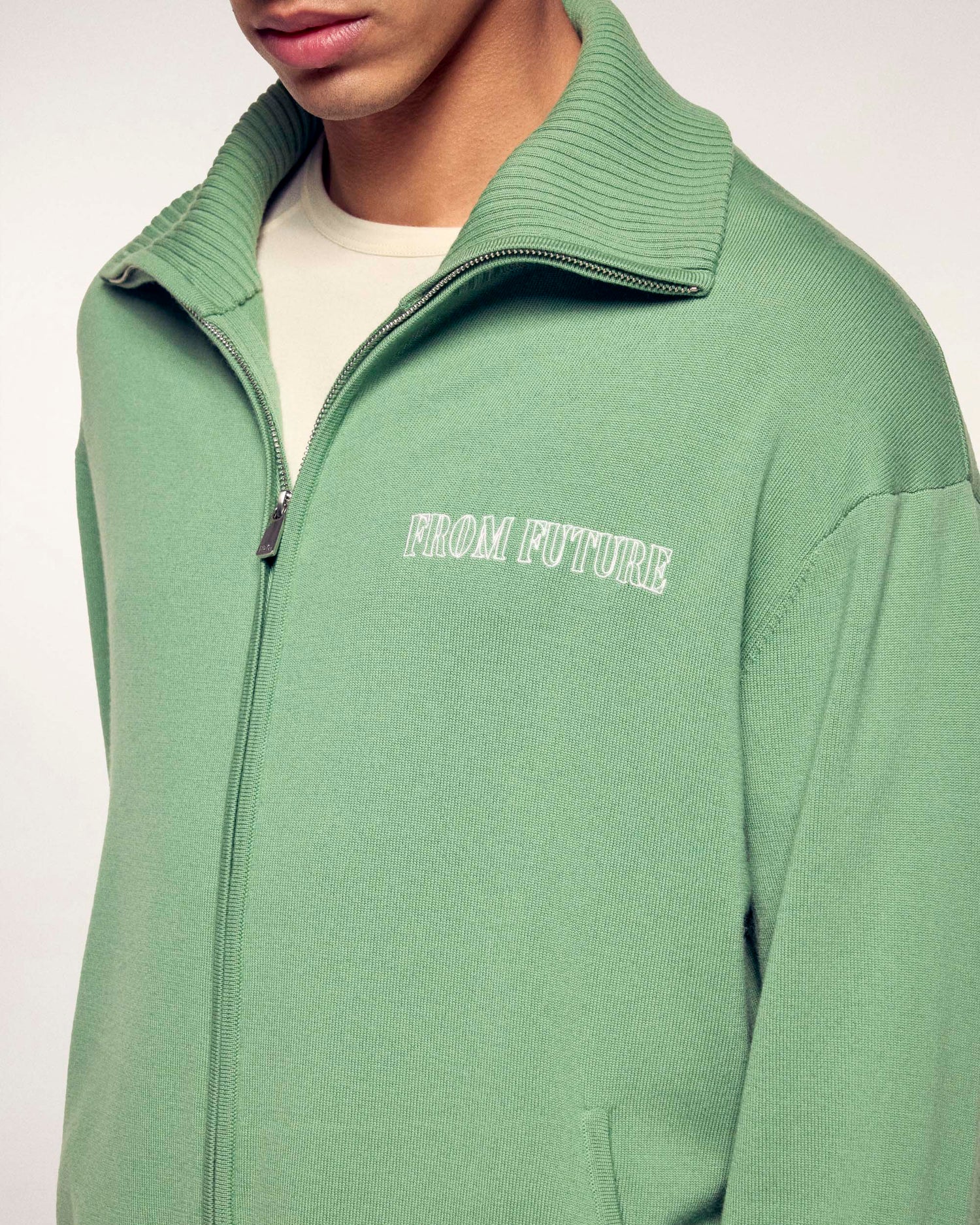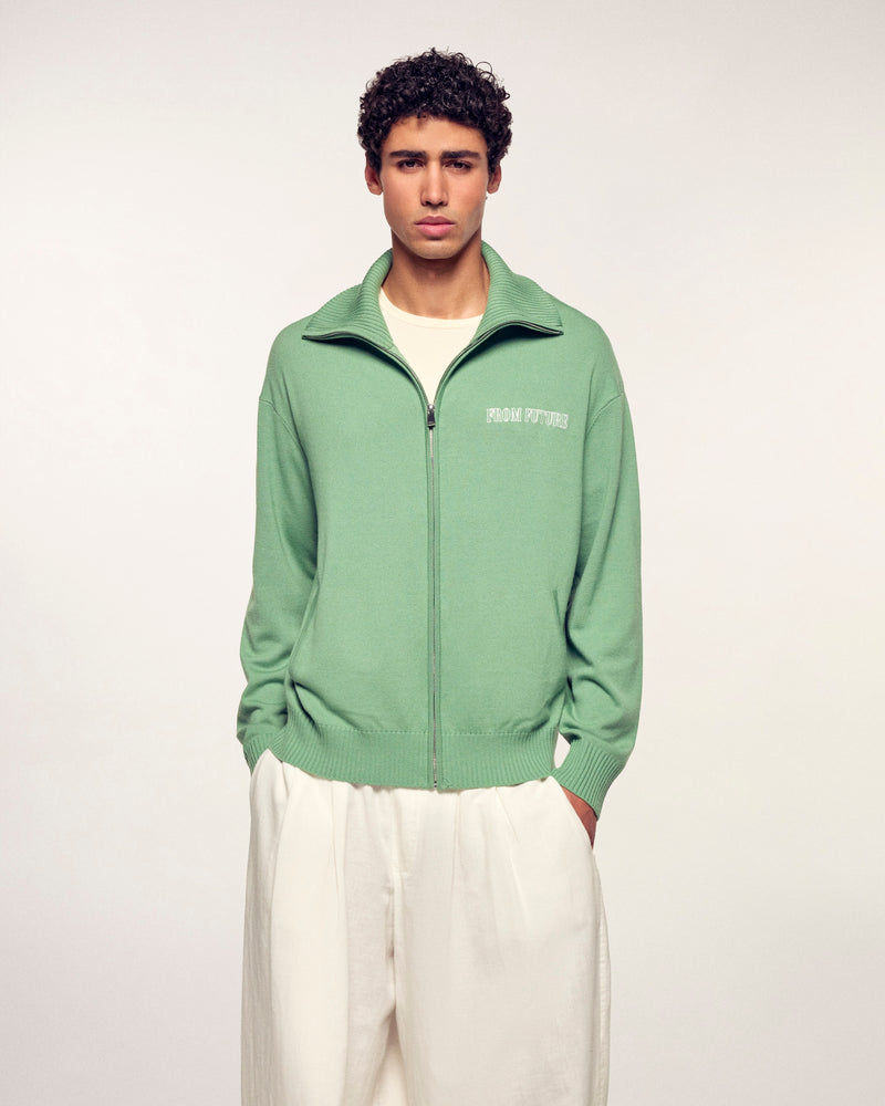 Ein Herzstück, das thermischen Komfort und urbanen Look vereint. Diese mit Reißverschluss versehene Weste aus 100% Merinowolle – RWS-zertifiziert (Responsible Wool Standard) 4 Fäden bietet einen dicken und schützenden Strick. Ihr Oversize-Schnitt wird durch einen schützenden Stehkragen und eine kontrastierende „From Future“-Stickerei auf der Brust unterstrichen.