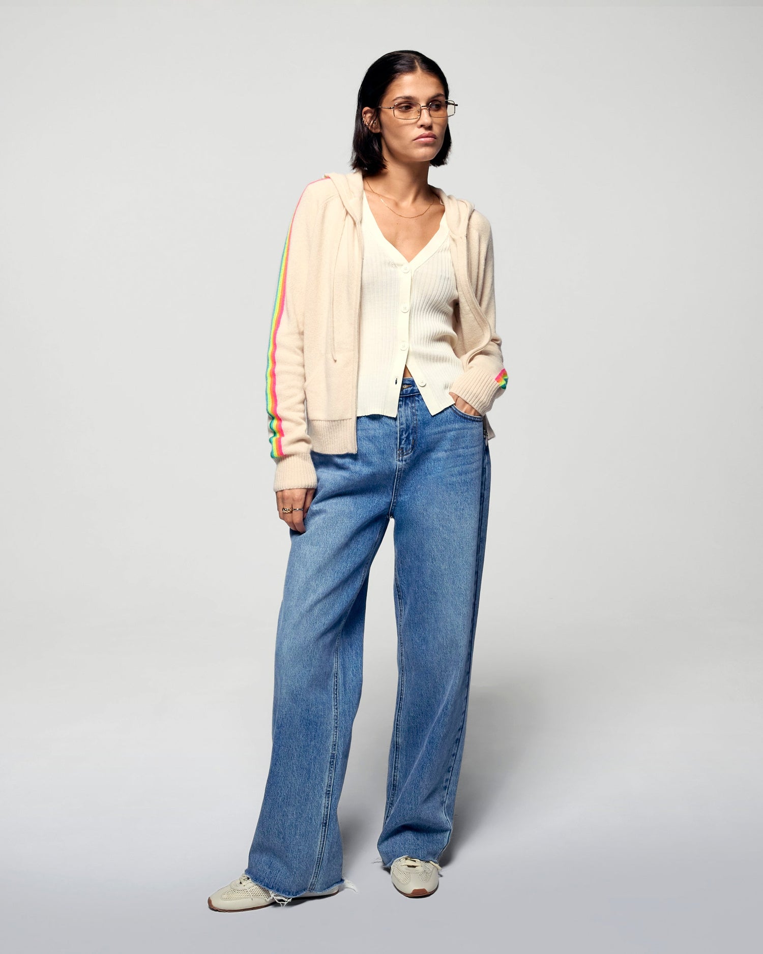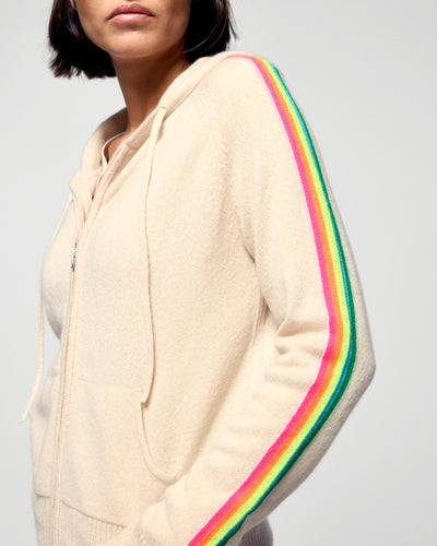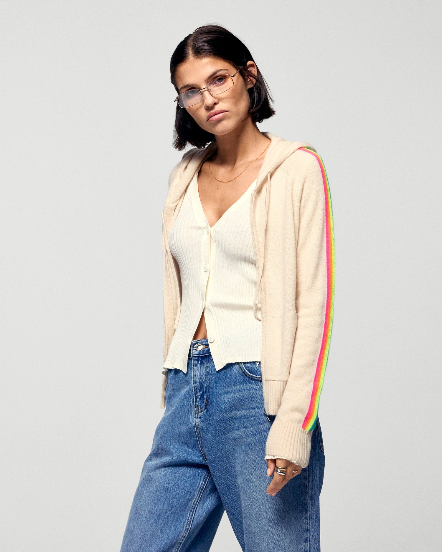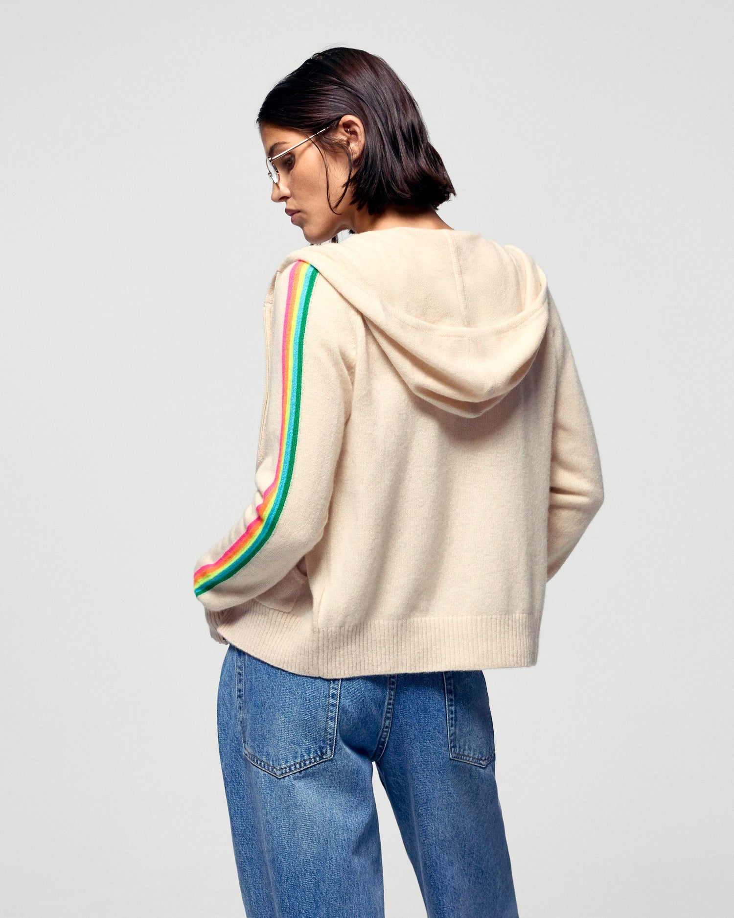 Dieser kurze Hoddie-Pullover mit mehrfarbigen Streifen entlang der Ärmel ist ein ikonisches Piece der From Future-Garderobe und setzt Ihre saisonale Silhouette in Szene. Er ist aus weichem und leichtem Kaschmir gefertigt und hat eine Kapuze mit Kordelzug, einen Reißverschluss und eine Fronttasche.