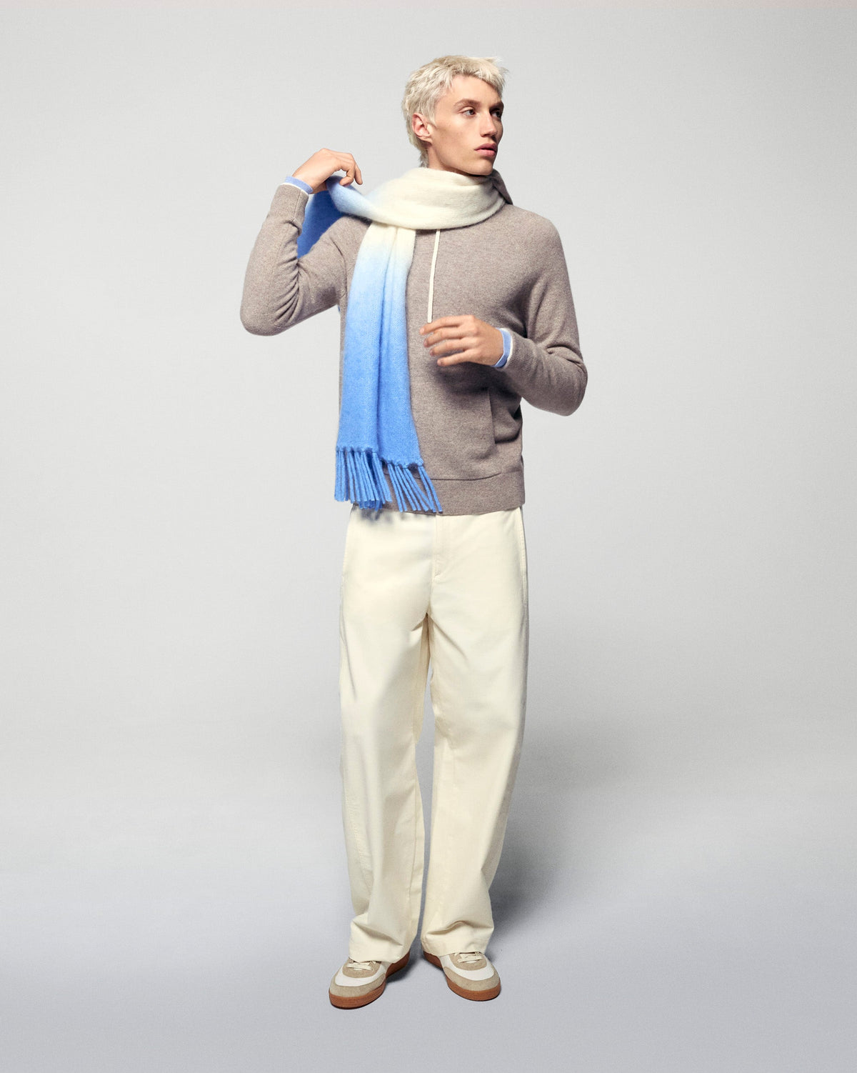 Der unumgängliche Hoodie-Pullover erfindet sich in dieser Saison neu und wurde mit kontrastierenden Einfassungen verziert. Er ist aus Kaschmir gefertigt und hat eine Kapuze mit Kordelzug, lange Ärmel und gerippte Abschlüsse. Oversized und strukturiert, kombinieren Sie ihn mit einem T-Shirt und einer Jeans.