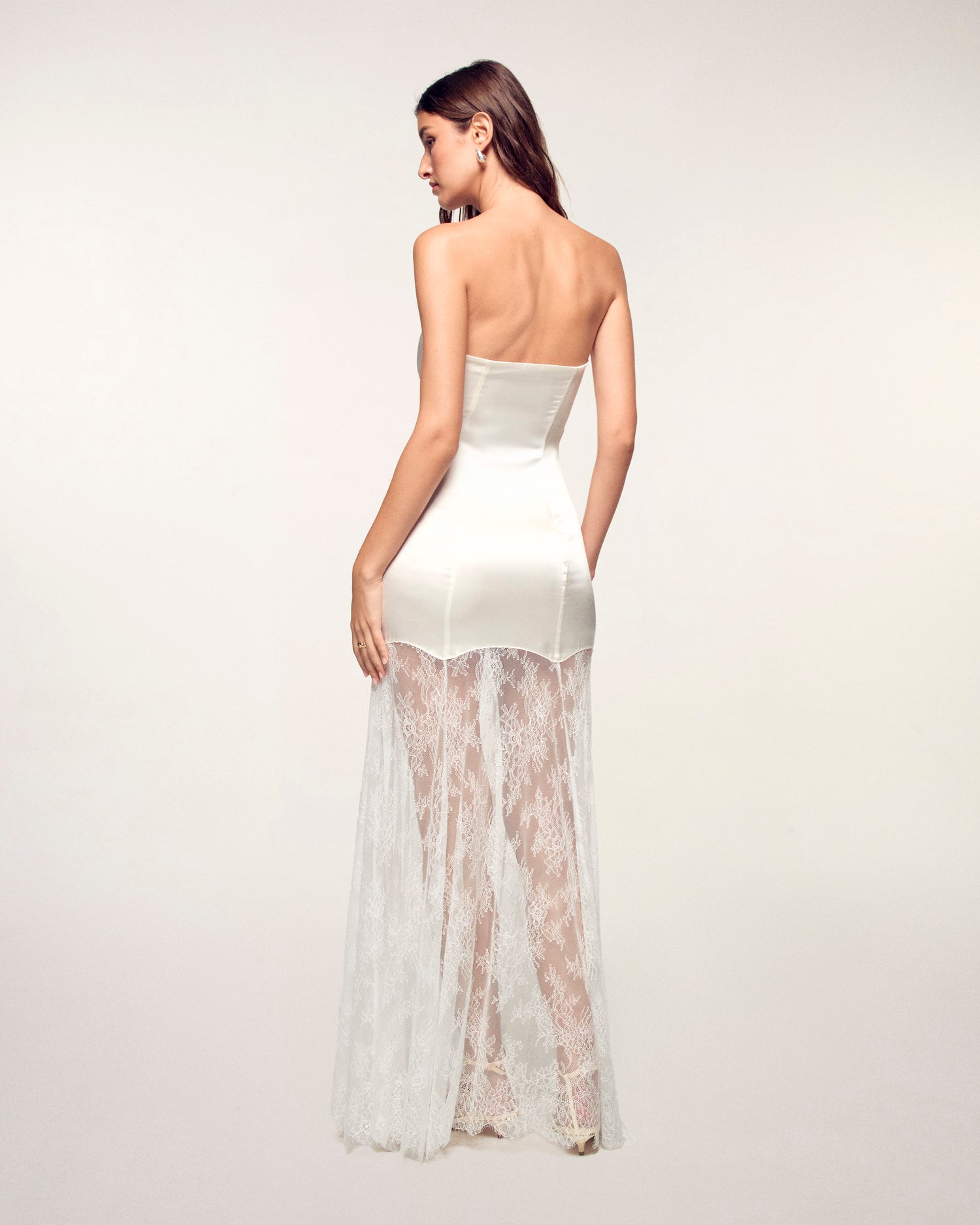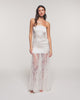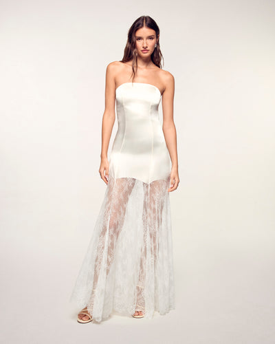 Pièce d'exception de votre vestiaire de cérémonie, cette robe longue en soie allie pureté et sophistication. Sa coupe bustier structurée en pure soie naturelle s'équilibre avec un bas de robe en dentelle ajourée, créant un jeu de transparence raffiné. Une silhouette de soirée luxueuse au tombé fluide et impeccable.