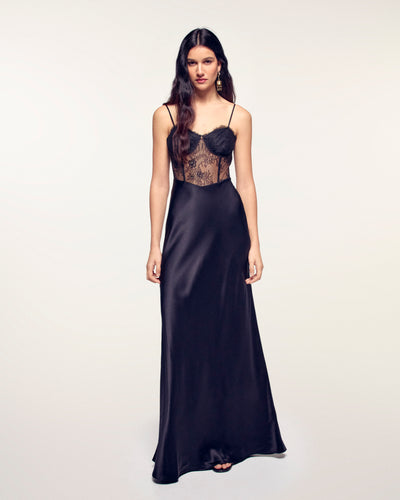 Dieses lange Kleid ist im unteren Teil aus 100 % Seide gefertigt und verfügt über ein Korsettoberteil aus Spitze, das eine sinnliche und anspruchsvolle Silhouette schafft. Ein unverzichtbares Stück für den Abend.