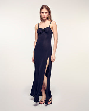 Eine elegante und skulpturale Silhouette, die mit unerwarteten Details spielt. Dieses Maxikleid aus Viskose-Jersey besticht durch sein Herz-Dekolleté auf der Vorderseite und seinen herzförmigen Ausschnitt am Rücken, ergänzt durch zarte Raffungen für einen zugleich romantischen wie entschlossen modernen Look.
