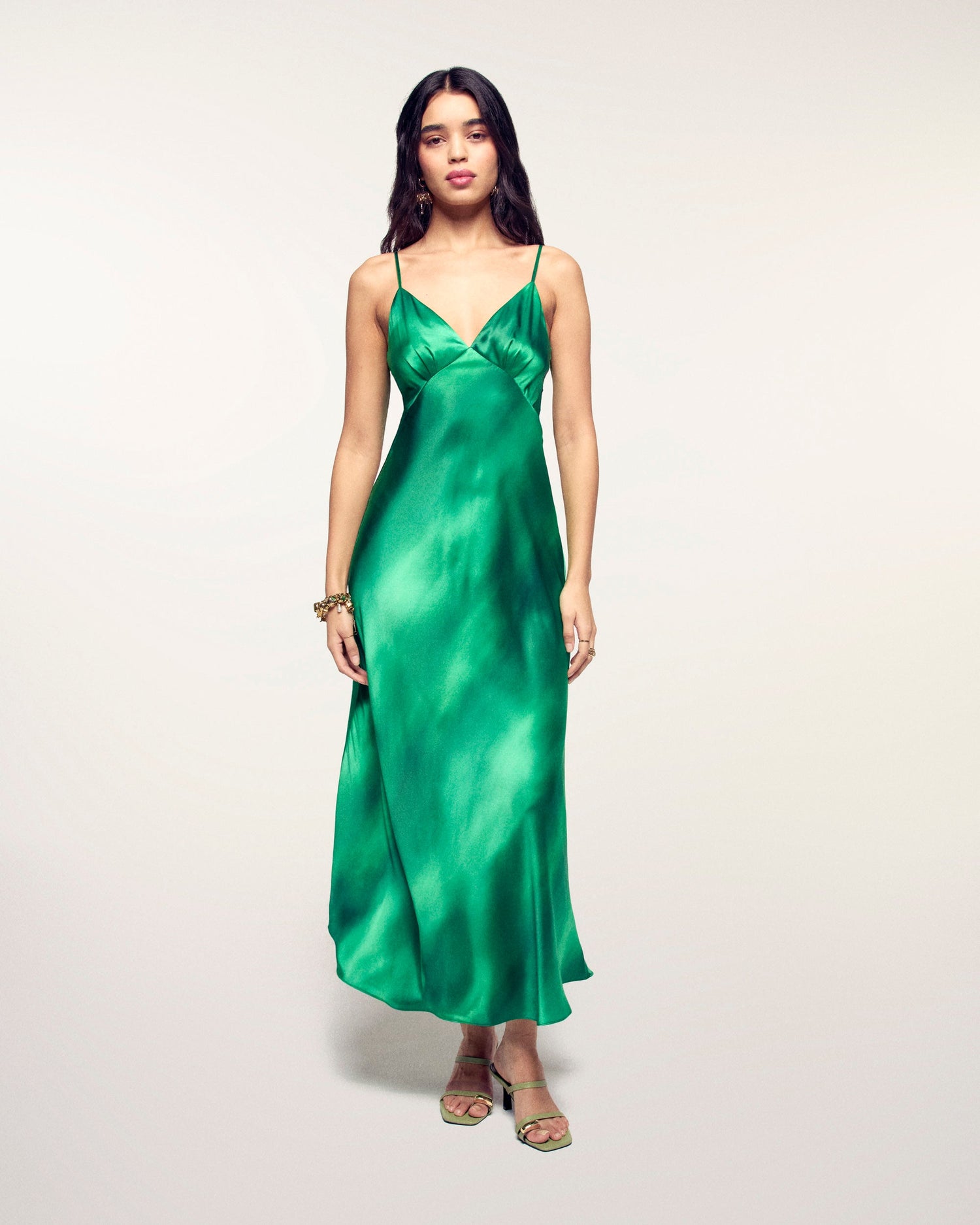 Sonnenhafte Eleganz für Ihre Garderobe mit diesem Maxikleid aus Seidensatin. Der verschwommene Print und die Slim-Fit-Passform kreieren eine stilvolle Silhouette, ergänzt durch einen V-Ausschnitt und verstellbare schmale Träger. Ein fließendes Modell mit ausgestelltem Saum, ideal für einen anspruchsvollen und leichten Look.