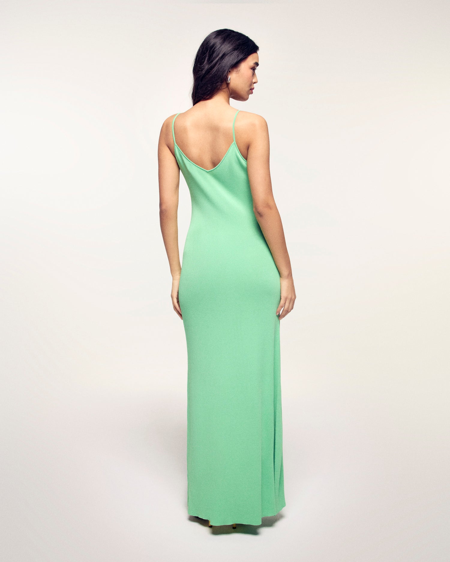 Dieses Kleid bietet eine lange und körpernahe Passform, perfekt um die Silhouette zur Geltung zu bringen. Gefertigt aus Viskose und Nylon, besticht es durch einen feinen Rippstrick. Sein kühnes Detail sind die sternförmigen Strassknöpfe, die das Dekolleté zieren.