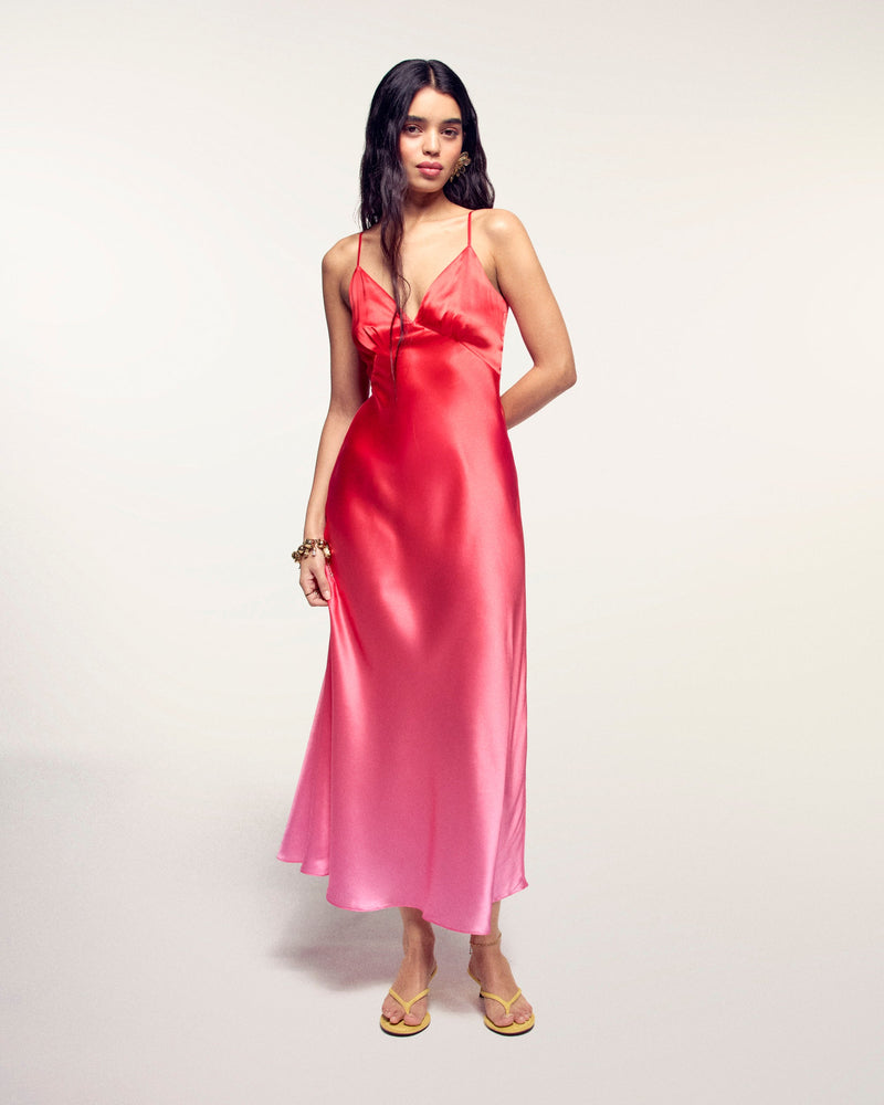 Sonnenhafte Eleganz für Ihre Garderobe mit diesem Maxikleid aus Seidensatin. Der verschwommene Print und die Slim-Fit-Passform kreieren eine stilvolle Silhouette, ergänzt durch einen V-Ausschnitt und verstellbare schmale Träger. Ein fließendes Modell mit ausgestelltem Saum, ideal für einen anspruchsvollen und leichten Look.
