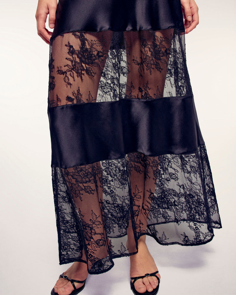 Dieses aus 100 % Seide gefertigte Modell besticht durch einen fließenden Fall und eine lange, schmale Passform. Sein Design wird durch breite Fischgrätmuster aus Spitze mutig strukturiert, was für Textur und Raffinesse sorgt.