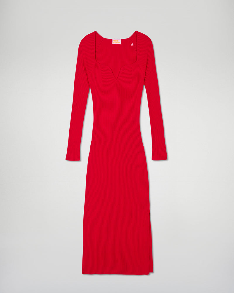 Dieses lange, figurbetonte Rippstrickkleid wurde aus Merinowolle mit RWS-Zertifikat (Responsible Wool Standard) gefertigt. Es hat lange Ärmel, einen herzförmigen Ausschnitt und einen geschlitzten, mit Kontrasteinfassungen verzierten Rockteil. Tragen Sie es wie eine zweite Haut und kombinieren Sie es mit Pumps für ein raffiniertes Outfit oder mit Sneakers für einen lässigen Look.